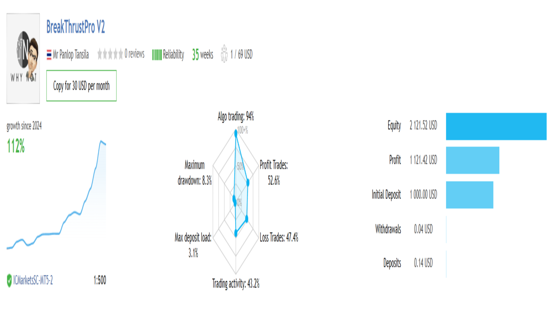 Breakthrust EA delivers strong and consistent results. Since it doesn’t use martingale, it’s a safer and more sustainable trading approach. The developer actively improves the EA with regular updates and provides great support when needed. A reliable and profitable system overall.