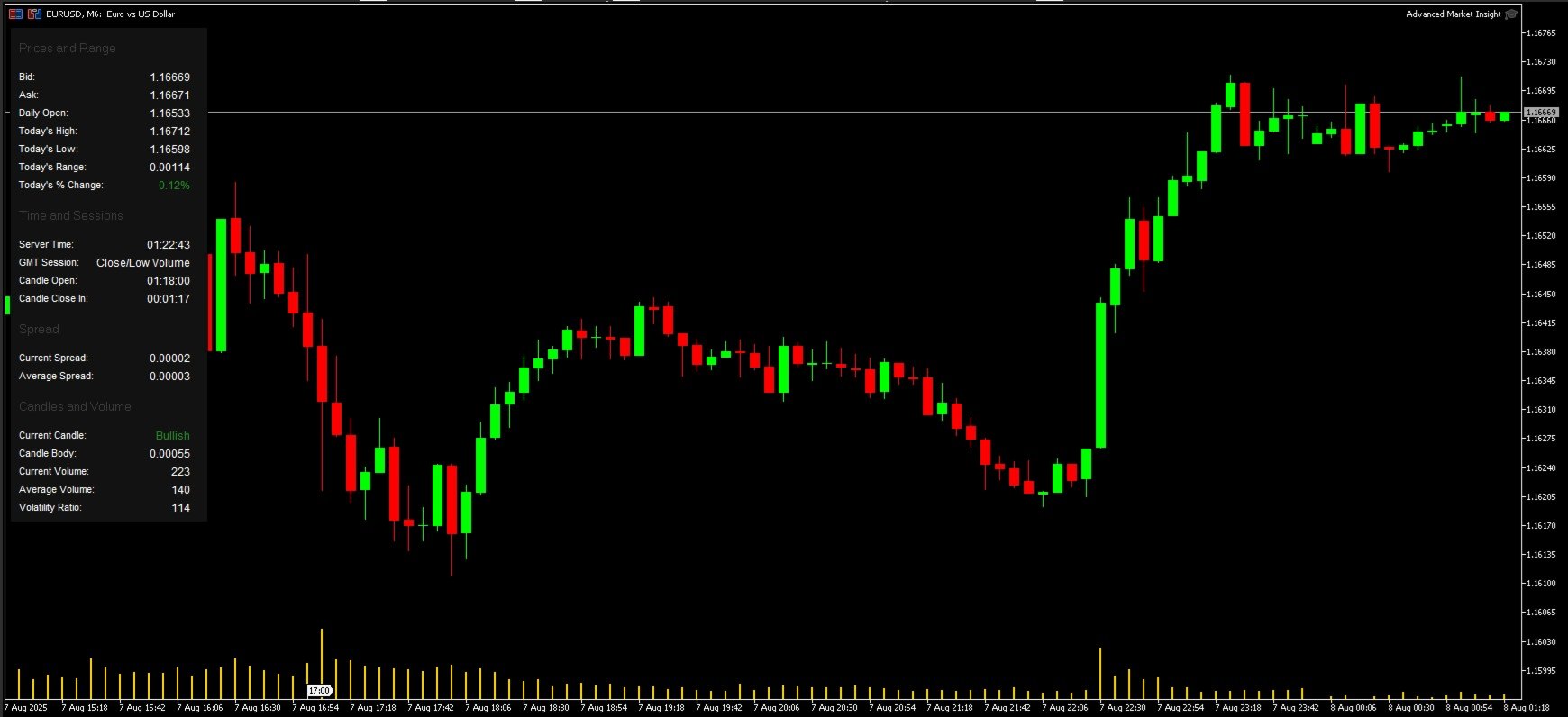 O Advanced Market Insight é um painel de informações visuais projetado para traders que buscam acesso rápido e organizado às métricas-chave do mercado, diretamente no seu gráfico do MetaTrader 5. Com uma estética limpa e profissional, inspirada em terminais financeiros avançados, este painel consolida dados essenciais para complementar sua análise e tomada de decisões.