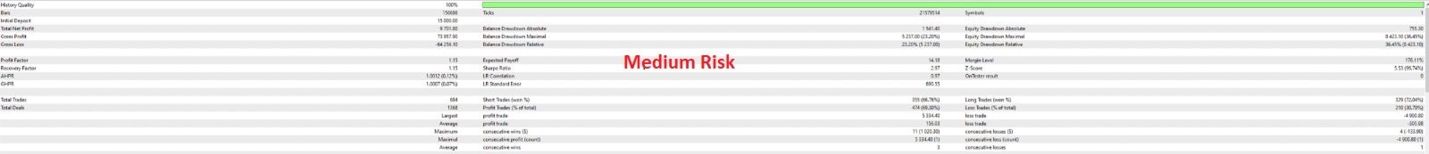 The risk level can be defined with the RiskLevel input, which changes the alters the trading model to suit the users risk appetite. Available risk levels are LowRisk, MediumRisk and HighRisk.