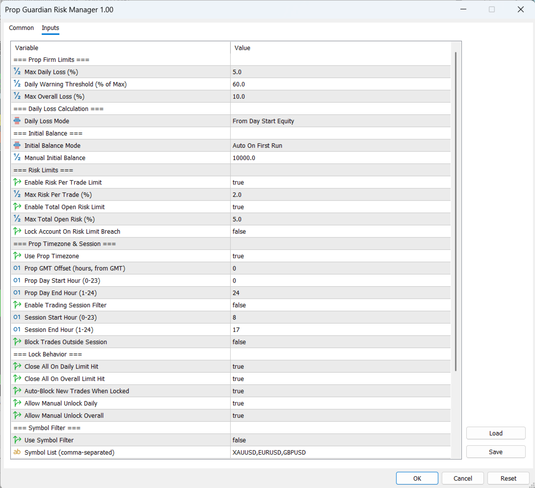 Prop Guardian Risk Manager is a professional risk-control utility for MetaTrader 5, created for traders who operate under prop firm rules. It does not open trades and does not implement any trading strategy. Instead, it runs in the background, monitors your account risk and can automatically block trading or close positions when your own limits are reached.