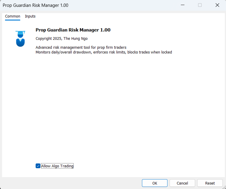 - Attach Prop Guardian Risk Manager to any chart in the account you want to protect.