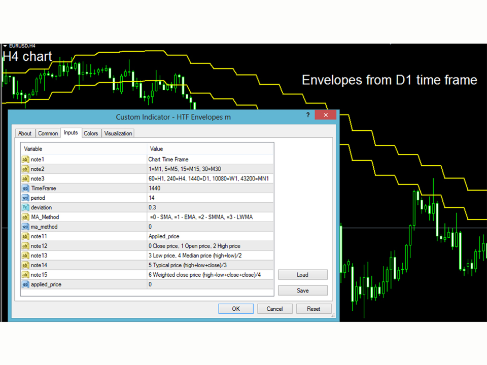 - O indicador permite anexar Envelopes de períodos de tempo mais longos ao seu gráfico atual.
