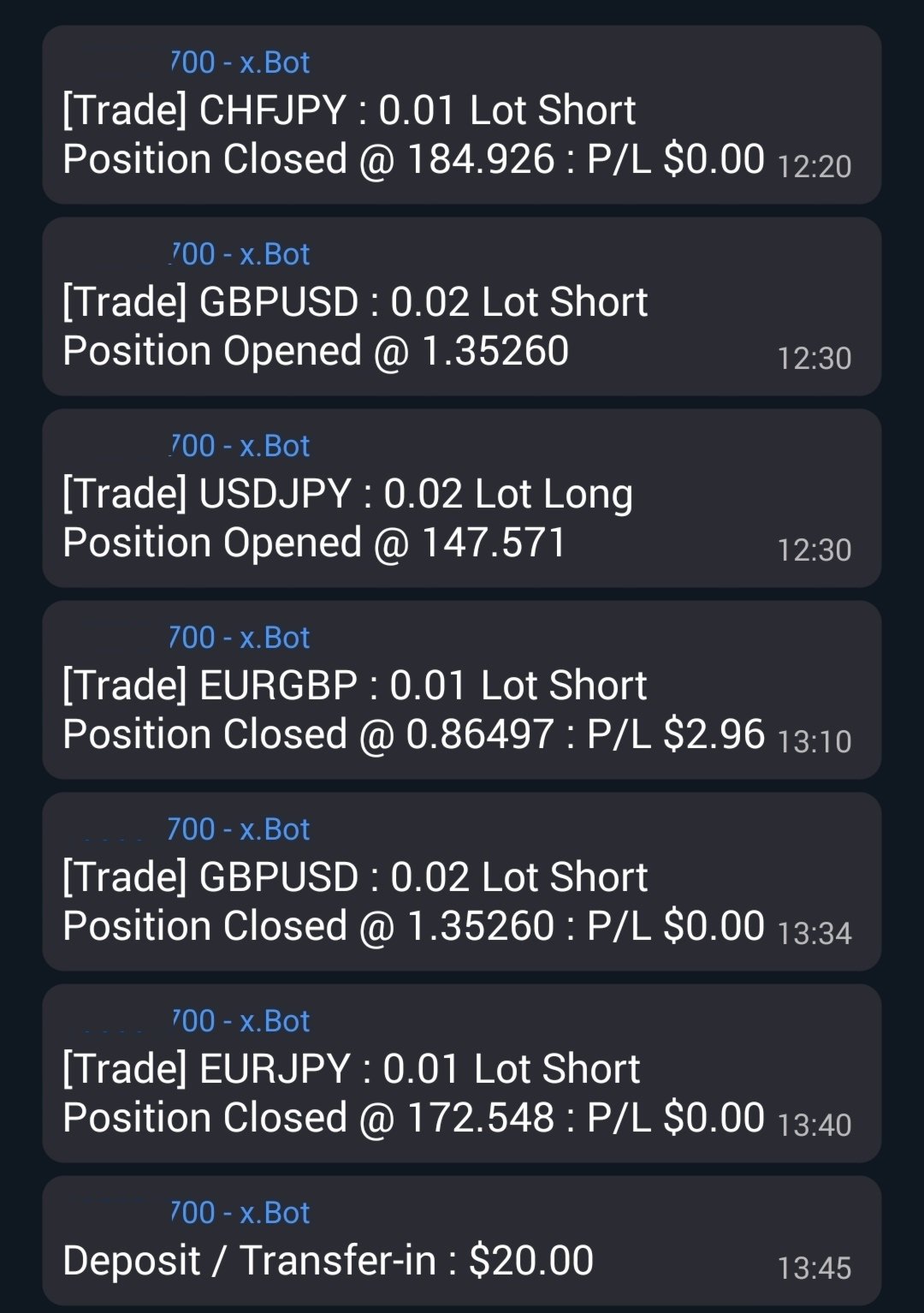 This utility sends only trade notifications (buy/sell/close) and deposit/withdrawal notifications. A sample of the notification format is given below. For customizations, please DM.
