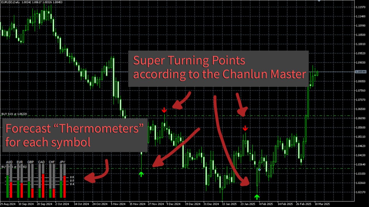 Chart Marking: The EA automatically plots triangular markers at the locations of historical and current "Super Turning Points," allowing you to see the AI's decision-making logic.