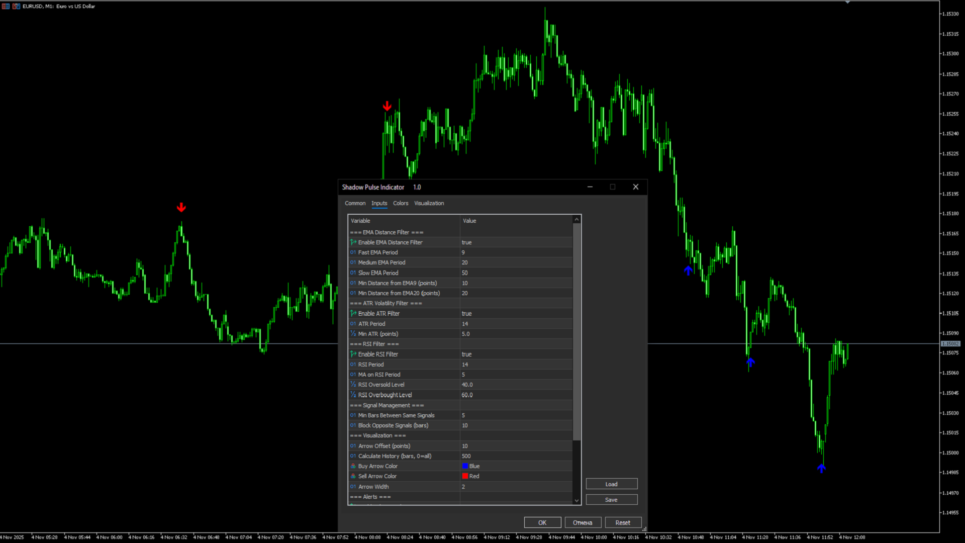 Shadow Pulse é um indicador profissional para identificar pontos de reversão baseado no método de reversão à média. Gera sinais de compra e venda de alta precisão usando um sistema inteligente de filtragem multinível.