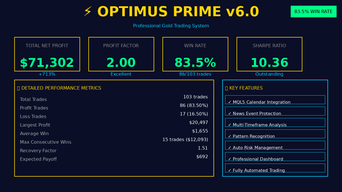 OPTIMUS PRIME is a complete trading ecosystem combining cutting-edge technical analysis with real-time economic calendar protection. Built for serious traders who demand both performance and safety.