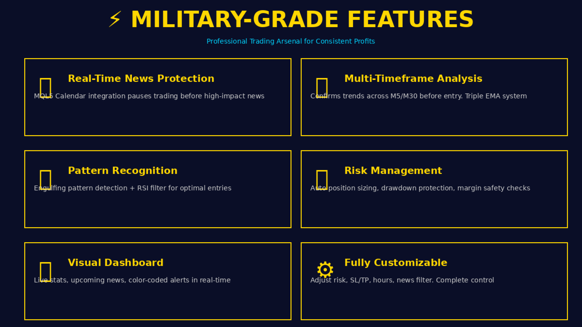 - Multi-Timeframe Trend Analysis (M5 + M30) ensures trades only with strongest market momentum
