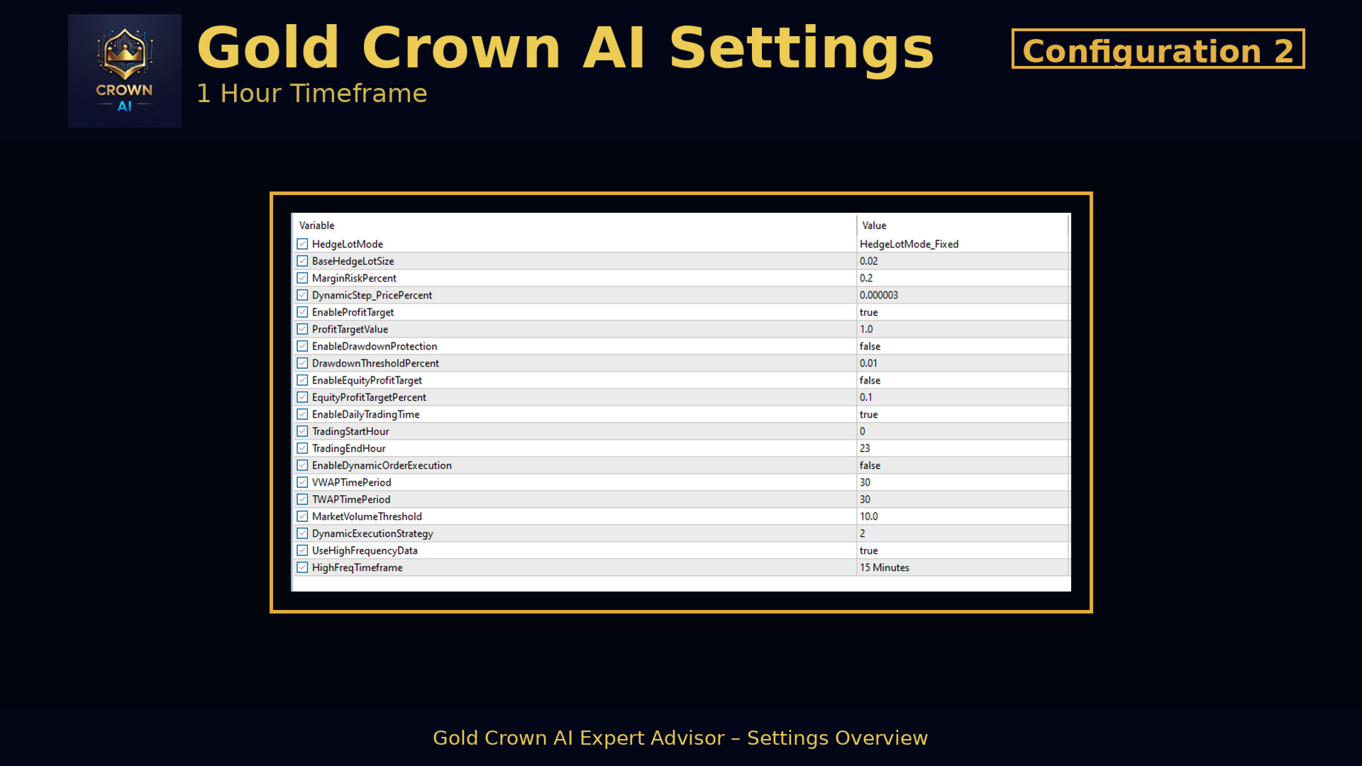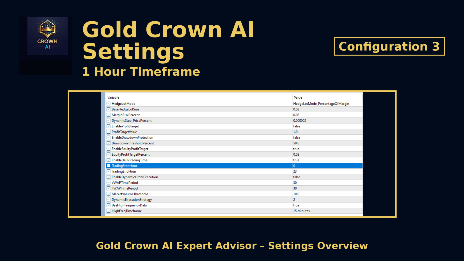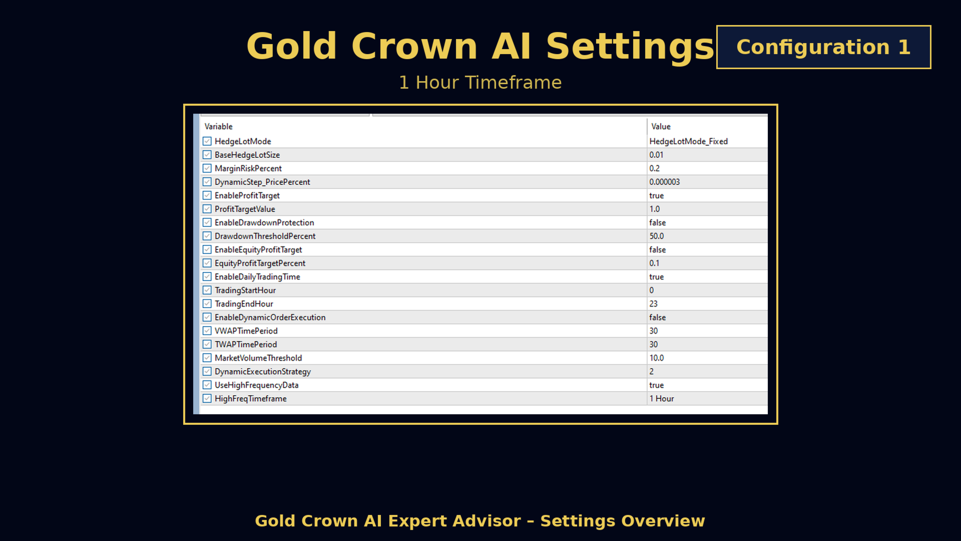 Gold Crown AI is a purpose‑built trading system for gold (XAUUSD) on the one‑hour timeframe. It combines adaptive hedging, volatility‑sensitive order execution and rigorous risk management, all orchestrated by advanced artificial‑intelligence algorithms. The result is a disciplined yet flexible approach to harnessing gold’s volatility. Three operating profiles let you align the system’s behaviour with your own risk tolerance:
