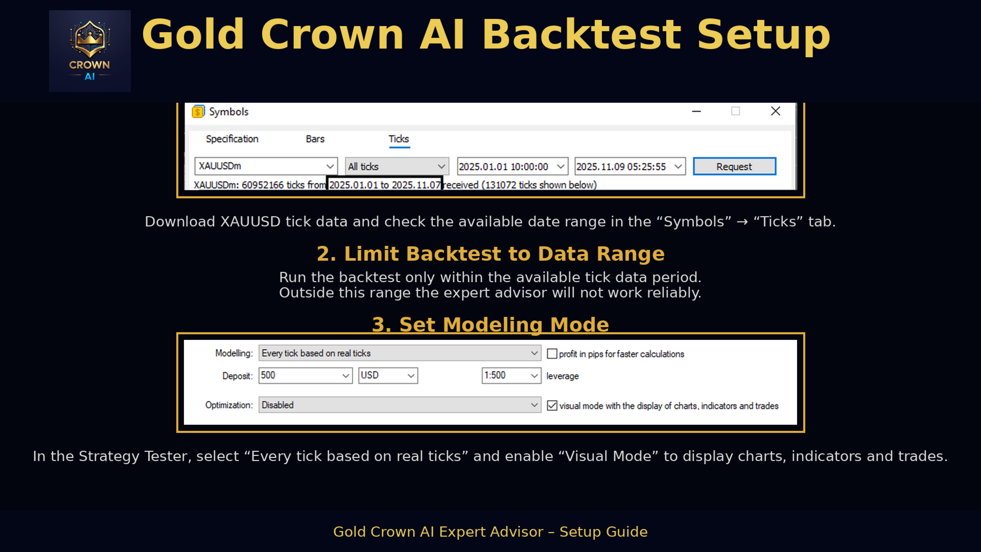 Gold Crown AI is a professional trading tool for XAUUSD (H1). All statistics provided are drawn from historical backtests and forward tests; they do not guarantee future results. Always practise sound risk management and recognise the inherent risks in trading financial markets.