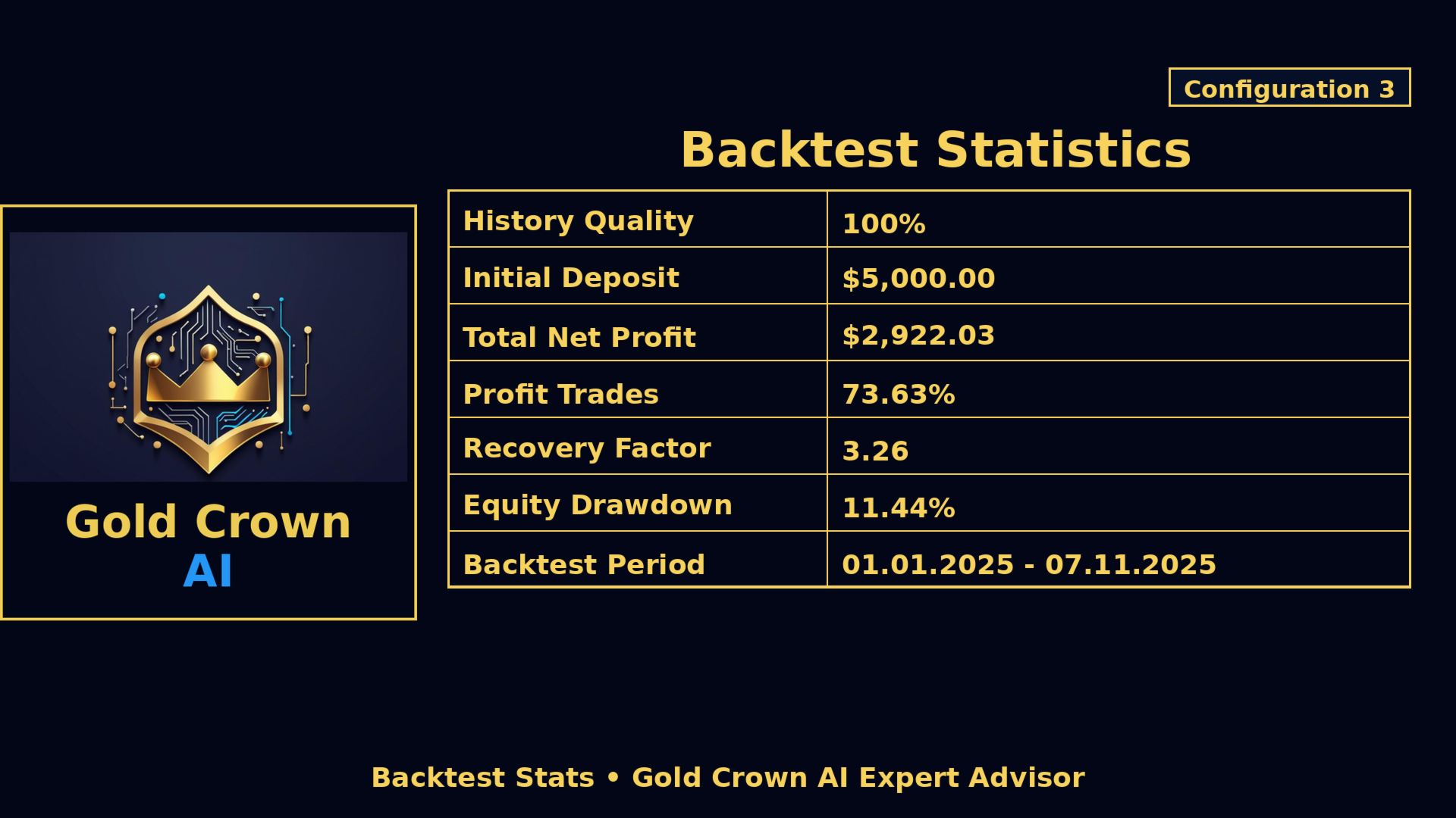 *Configuration 3 uses a margin‑based risk percentage , producing a lower drawdown (~11.44 %, or US$896.95 in the backtest) and maintaining long/short win rates around 72–76 %. These results derive from historical backtests using real tick data and variable spreads.