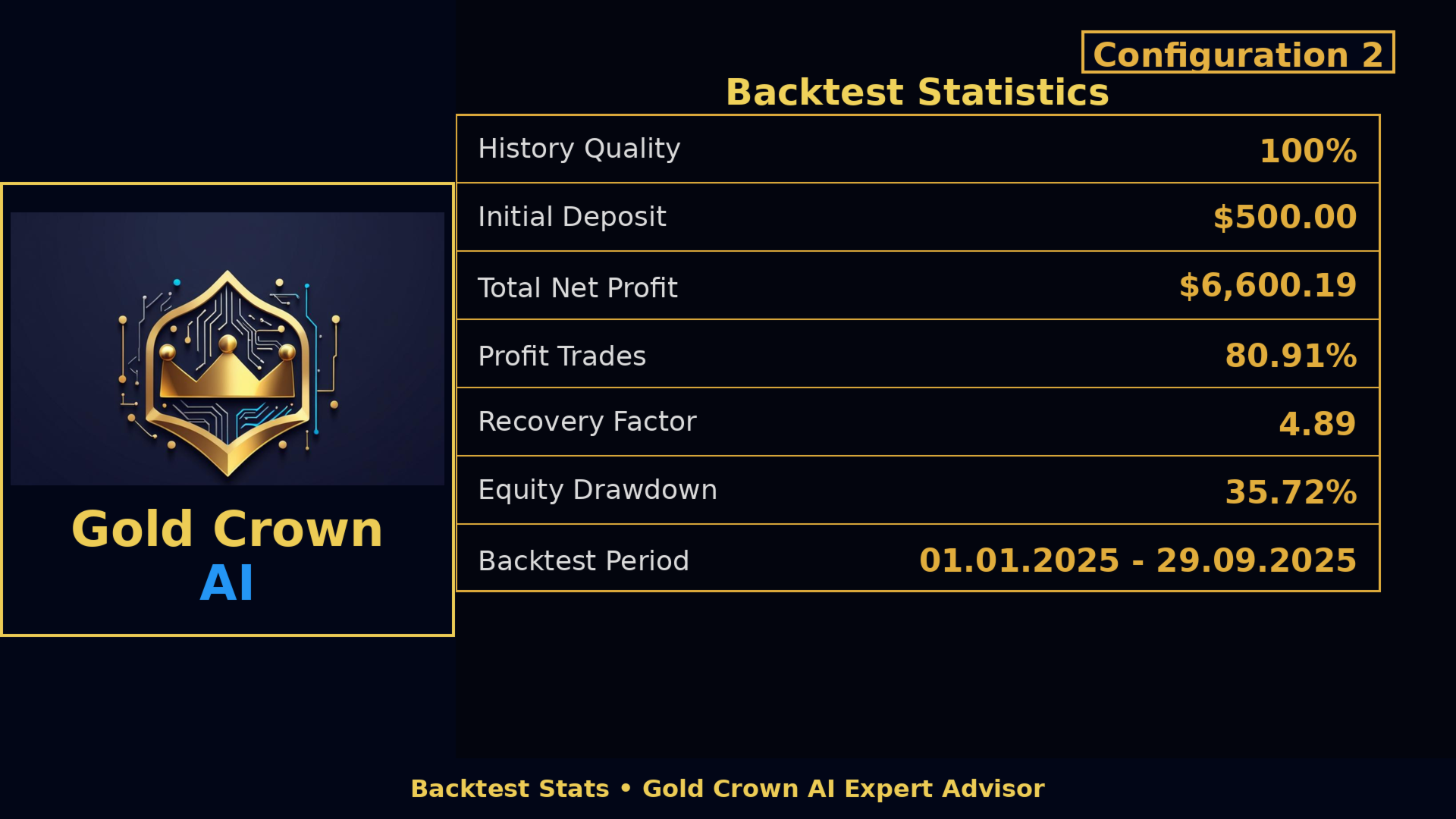 | Configuration 2 (0.02 lot) | US$500 | ~US$6 600.19 | ~81 % | 4.89 | ~35.72 % |