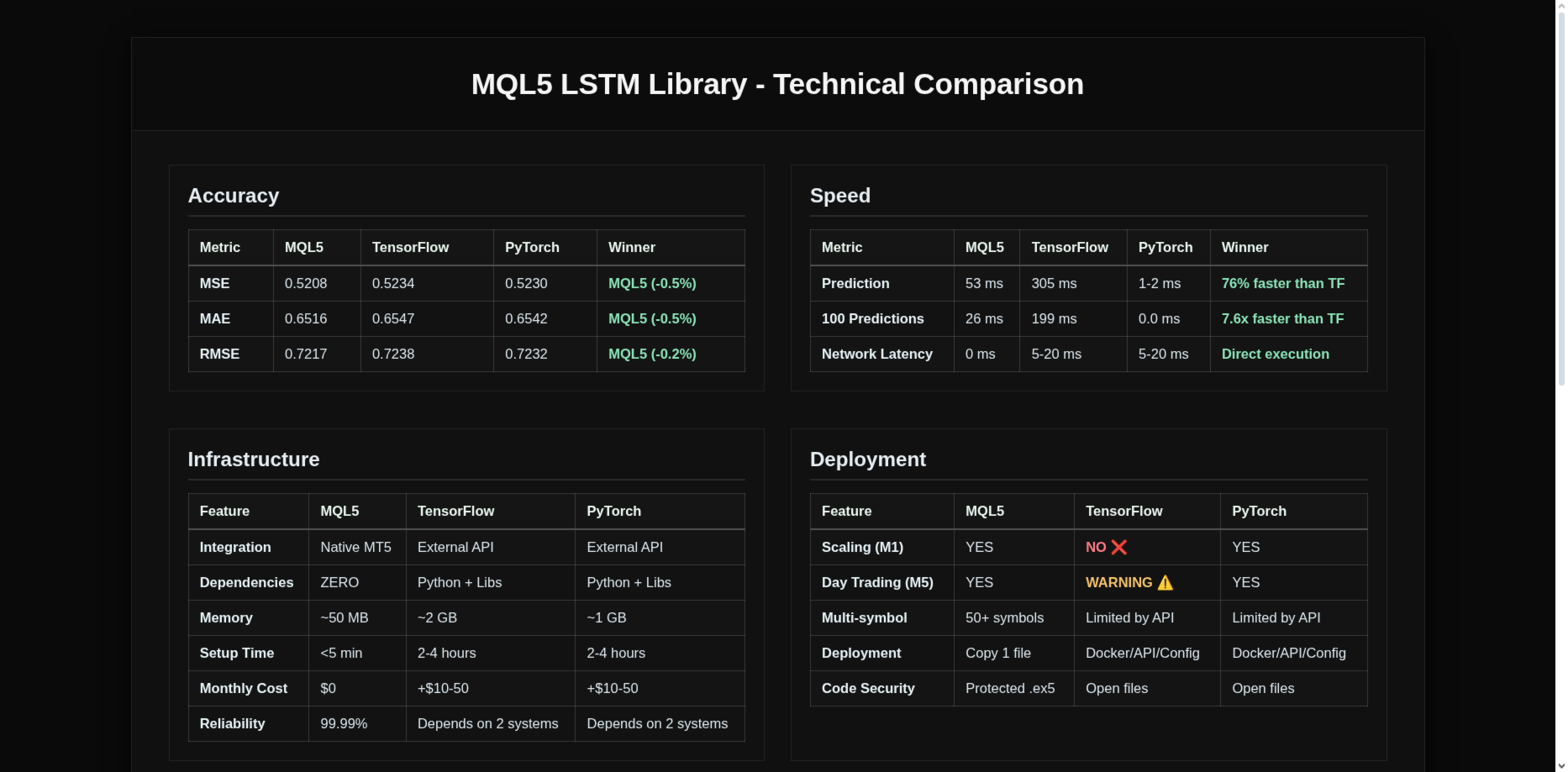 A LSTM Library foi projetada para ser facilmente integrada em seus EAs e indicadores, fornecendo recursos avançados de machine learning diretamente no MetaTrader 5.