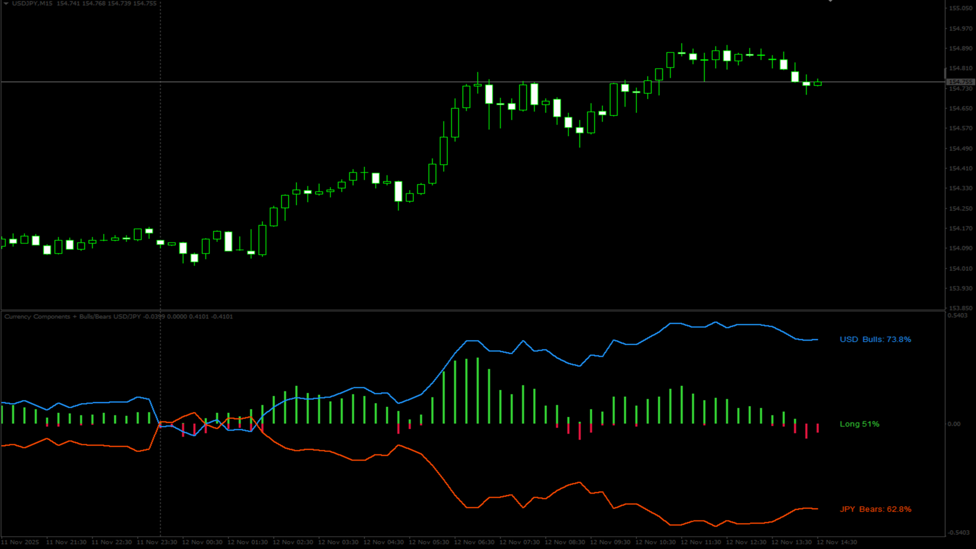 Ele combina de forma inteligente a dinâmica da força da moeda , a análise da força dos touros/ursos e o sentimento em tempo real em um único indicador fácil de ler.