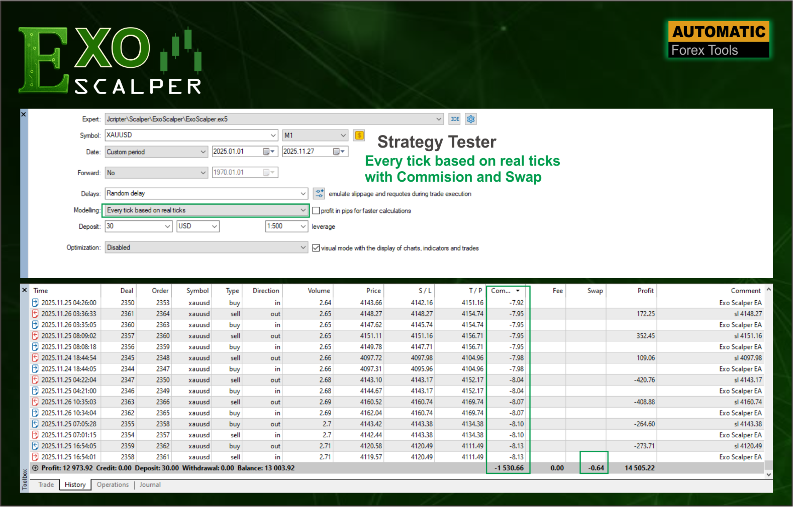 Exo Scalper is an Expert Advisor designed with a price strength comparison model summarized in a box zone indicator. Each box zone identifies a trend level within a specified candlestick period. The integration between the boxes has been thoroughly customized and is designed for scalping, providing more precise entry signals. The testing model not only uses the "Every tick based on real ticks" mode but is also adjusted by adding Commission and Swap to ensure test results are close to or identical to actual ticks in the real market.