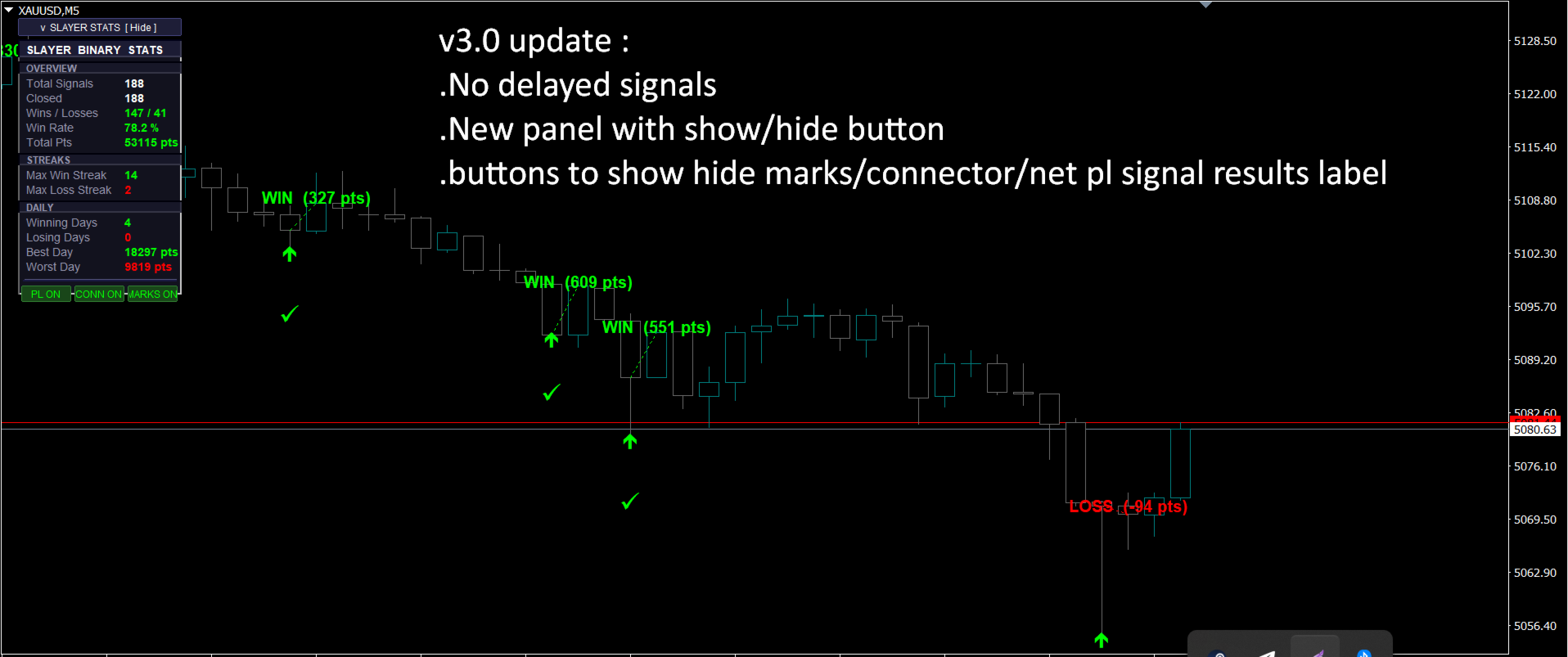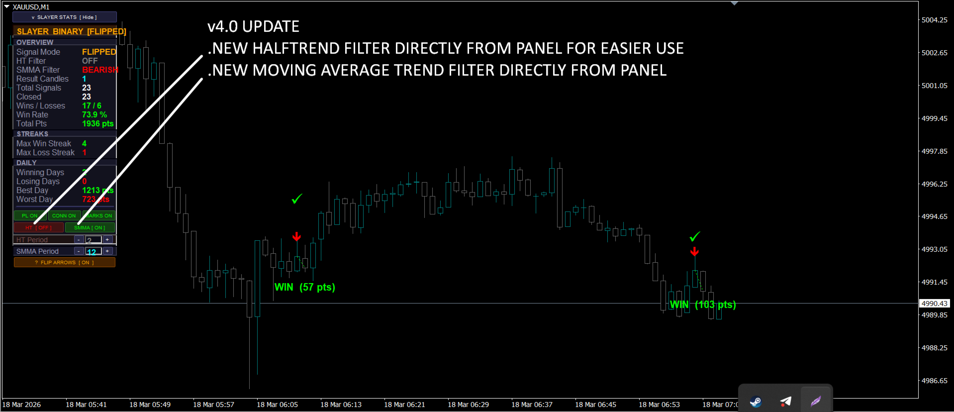 Slayer Binary é um indicador de seta de uma vela com opções binárias. Esse indicador não é para quem busca o santo graal, pois é uma abordagem irrealista para o trading em geral. O indicador apresenta uma taxa de acerto constante e, se usado com gestão de dinheiro e uma meta diária, será ainda mais confiável. O indicador vem com muitos recursos listados abaixo: