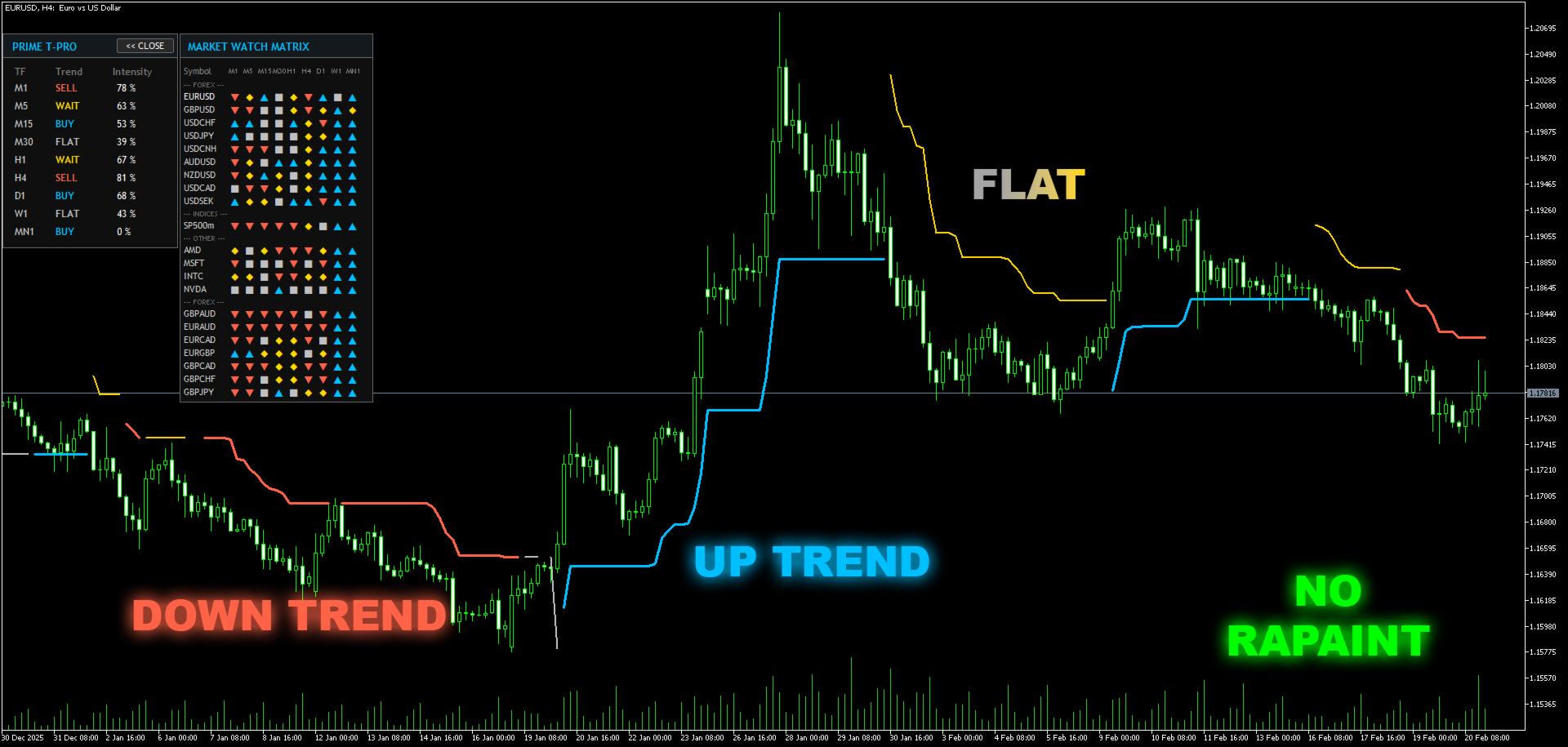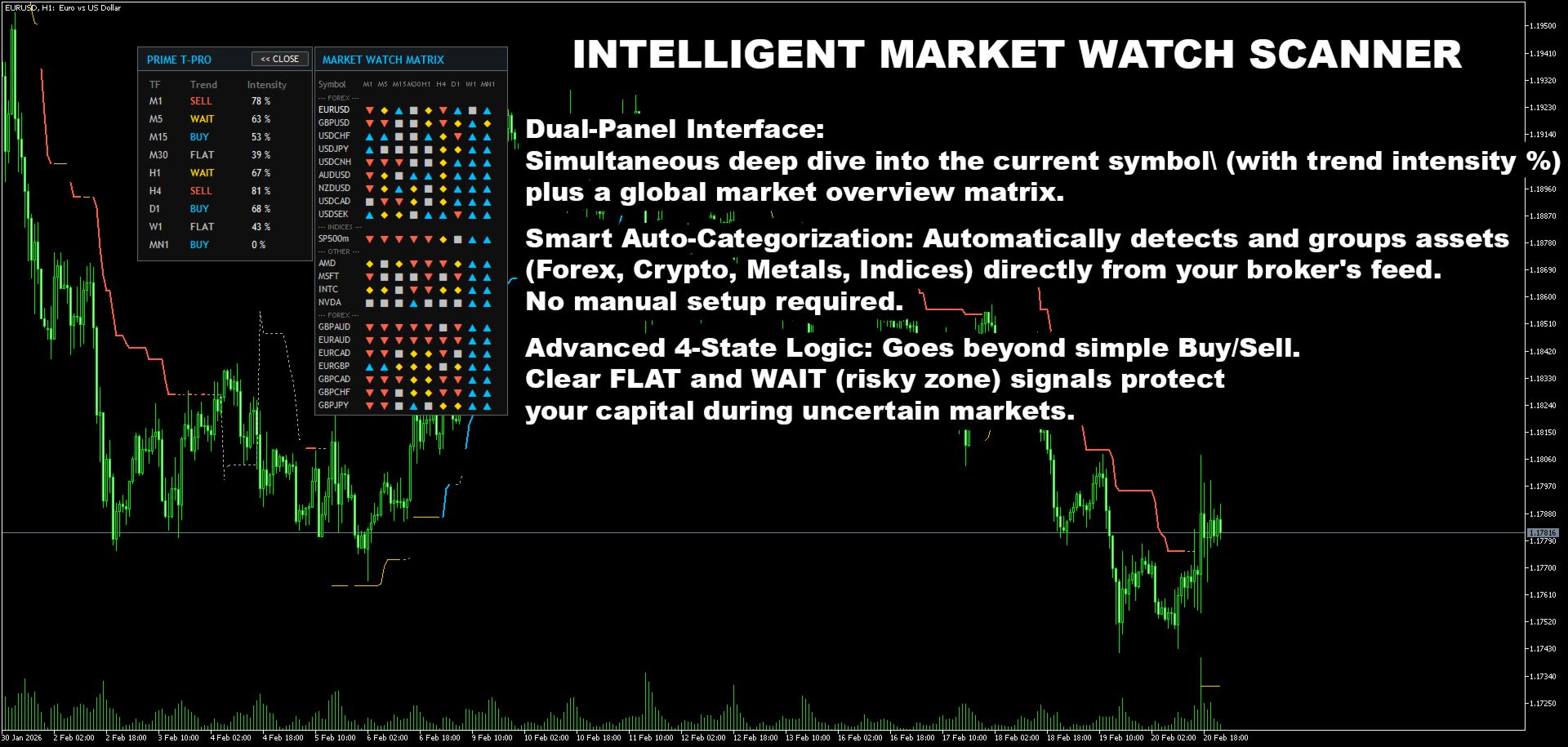 Prime Trend Pro is a professional trend-following indicator designed to solve the biggest problem in trading: losing money during chopping (sideways) markets.