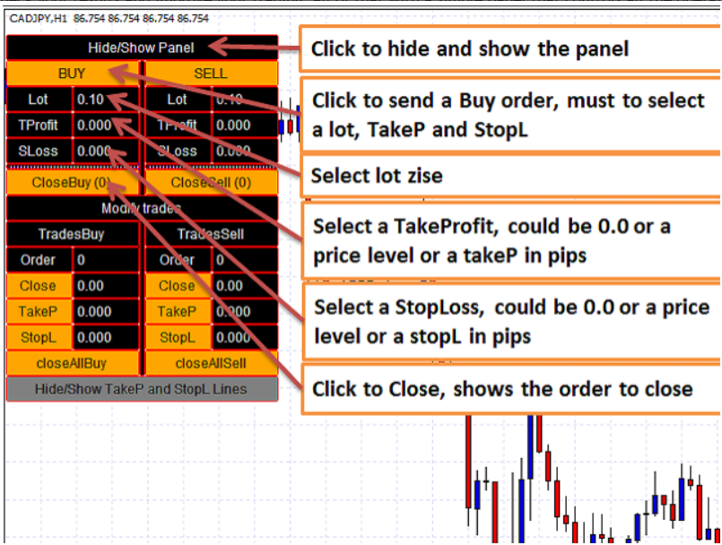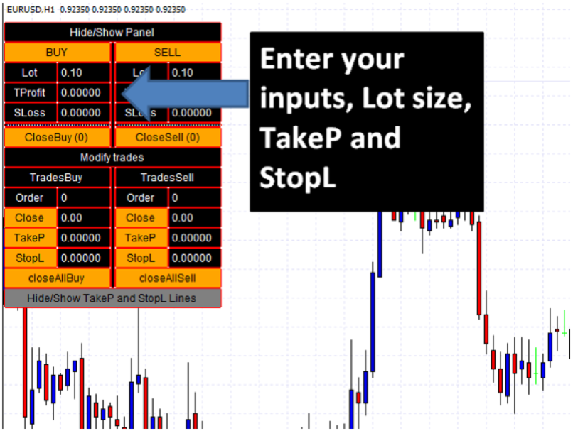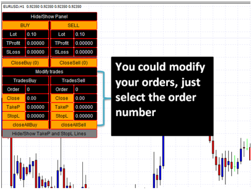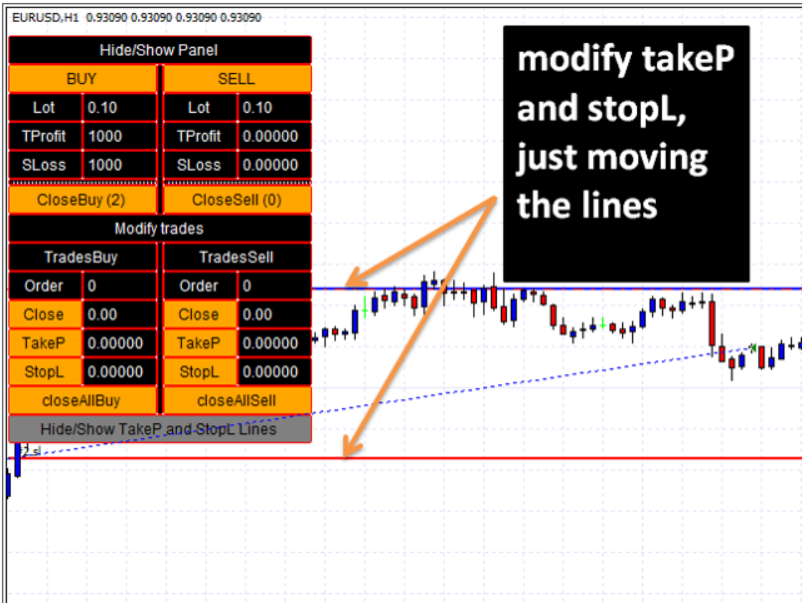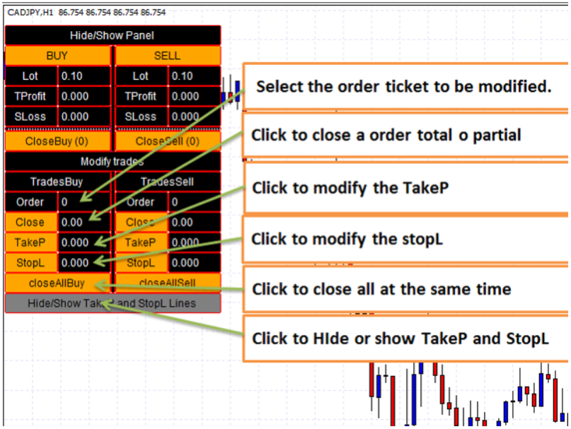 • Botão/caixa TakeP: modifica o *take profit* da ordem selecionada
