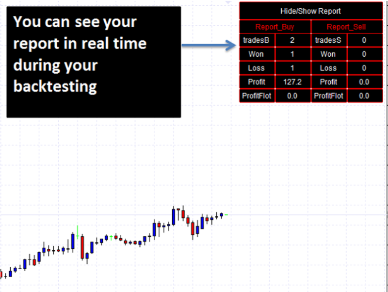 Durante o *backtesting*, o **TesterPro** fornece um relatório em tempo real com informações detalhadas sobre seu desempenho, incluindo operações vencedoras, operações perdidas, lucro total e lucro flutuante. Os painéis podem ser facilmente ocultados ou exibidos com um único clique.