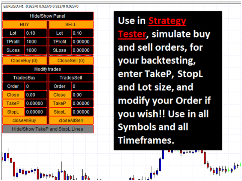 TesterPro é um painel desenvolvido para uso no *Strategy Tester* do MT4. Ele permite simular ordens de compra e venda, definir tamanho de lote, *take profit* e *stop loss*. Você pode modificar suas ordens abertas e fechá-las parcialmente a qualquer momento. Também é possível ajustar os níveis de *take profit* e *stop loss* simplesmente arrastando as linhas correspondentes com o mouse.