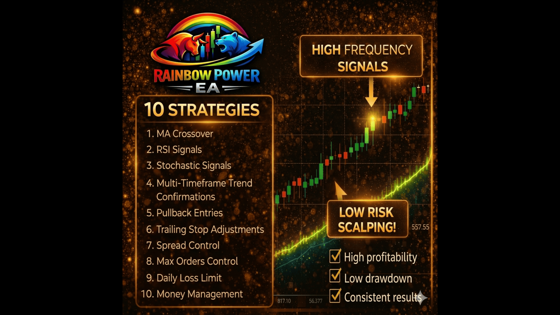 Rainbow Power EA v4 é um Expert Advisor (EA) profissional projetado para a plataforma MetaTrader 5 (MT5), utilizando uma robusta estratégia de negociação baseada em momentum, impulsionada pelos indicadores Bulls Power e Bears Power. Este EA foi desenvolvido para apoiar tanto traders manuais quanto sistemas totalmente automatizados, fornecendo uma estrutura completa de gerenciamento de risco que é ideal para os principais pares de Forex e XAUUSD (Ouro).