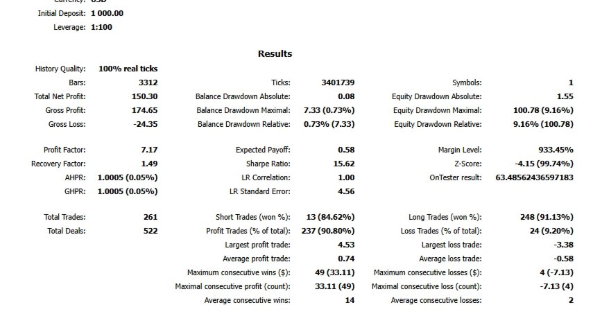 Trading frequency may vary. There can be periods when no trades are opened, depending on market conditions and internal filter states. Results depend on broker execution quality, spreads, VPS stability, and overall market volatility. It is strongly recommended to test different configurations in the MetaTrader 5 Strategy Tester before deploying to a live account. The EA is designed for ECN-type brokers. Performance on market-maker or fixed-spread brokers may differ. A minimum account balance of 200 USD is required for safe operation at 0.01 lot size. A balance of 300 USD or more is recommended when running 2–3 simultaneous positions.