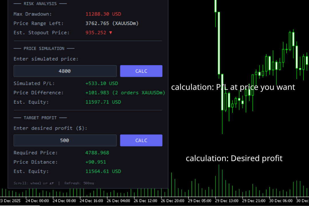 Enter a desired profit amount and the EA reverse-calculates the exact price the current chart symbol needs to reach.