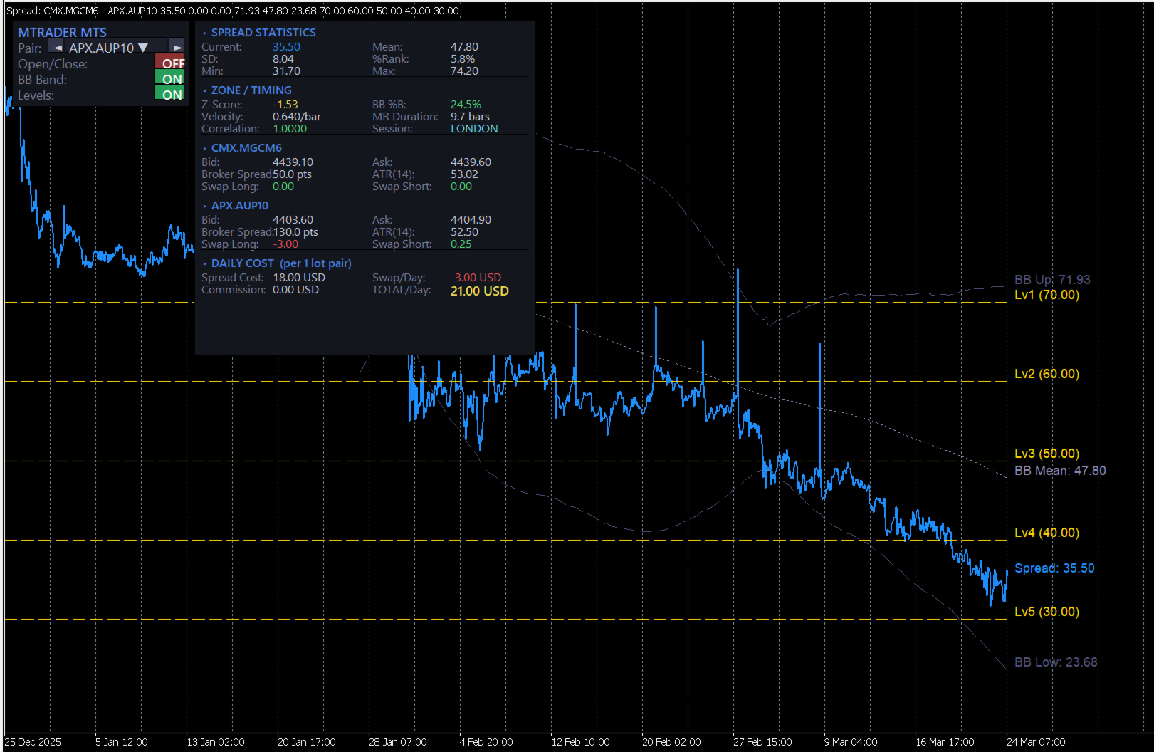 Shows where the current spread sits inside the Bollinger Band structure.