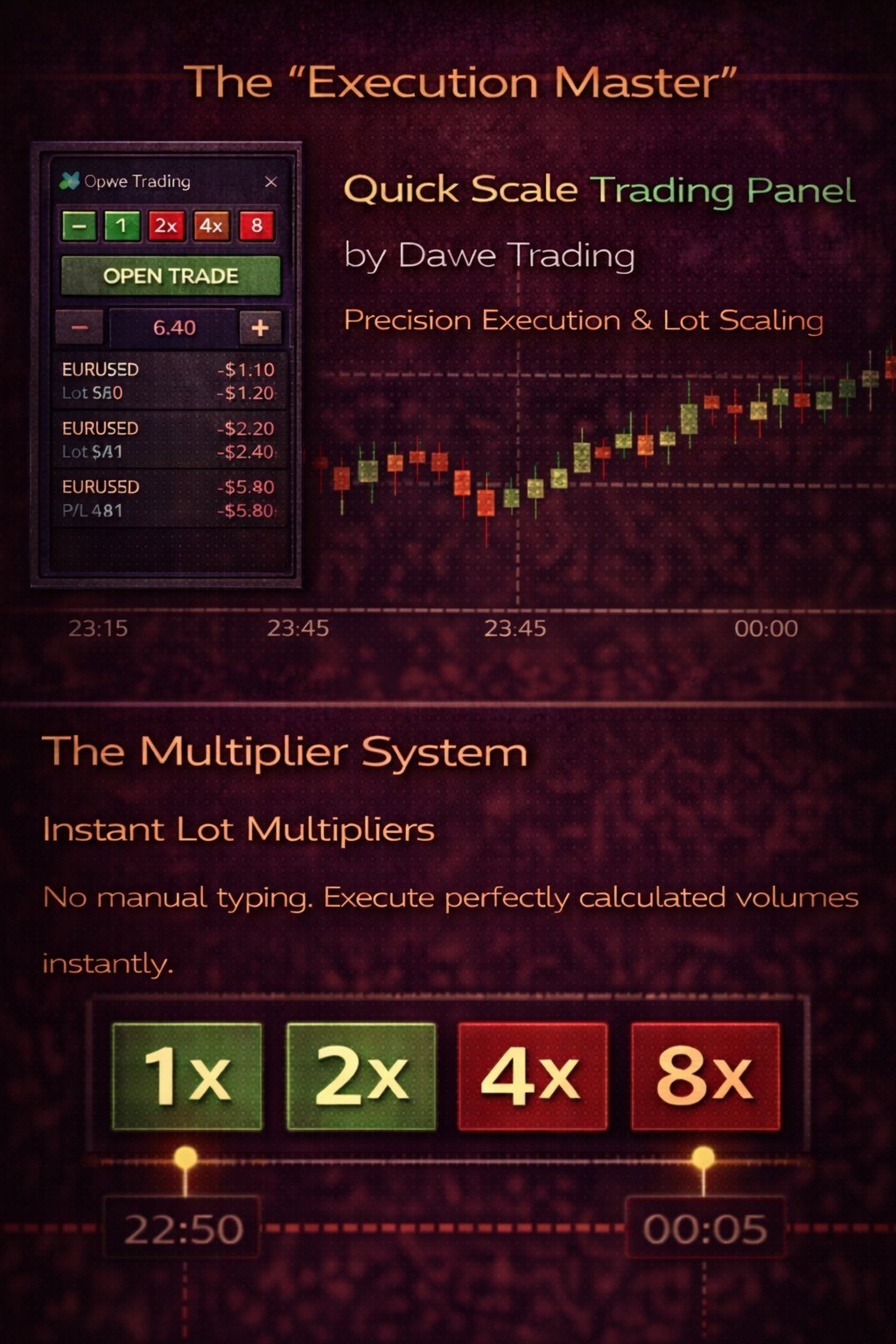 Instant Lot Multiplier System: Define your base lot size in the settings (e.g., 0.10) and use the dedicated 1x, 2x, 4x, and 8x buttons to instantly execute trades with mathematically perfect volumes. No more typing in high-stress moments!