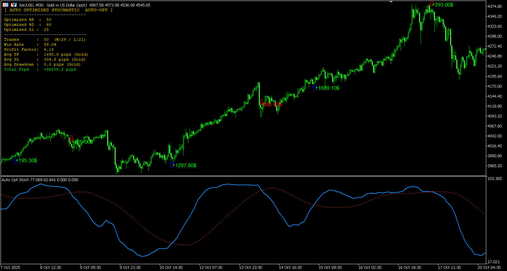 Visão Geral O oscilador Estocástico padrão perde eficácia quando a volatilidade do mercado muda. O Auto Optimized Stochastic resolve isso testando continuamente (backtesting) centenas de combinações de parâmetros diretamente no seu gráfico em tempo real. Ele aplica automaticamente os períodos de %K, %D e Desaceleração (Slowing) mais eficazes com base na ação recente do preço, garantindo que seus sinais se adaptem consistentemente ao ritmo atual do mercado.