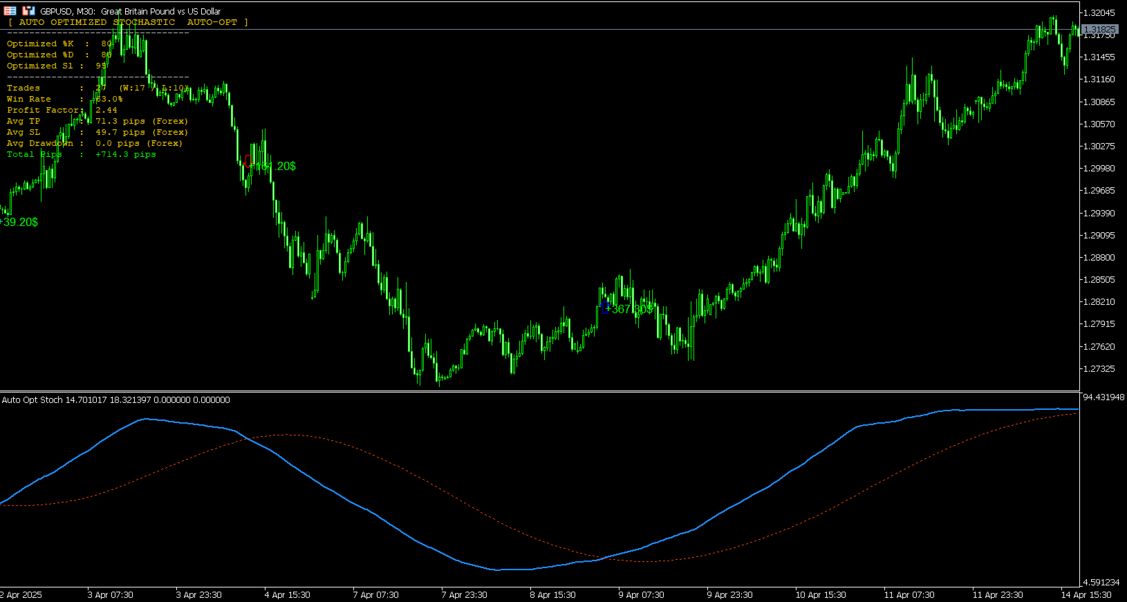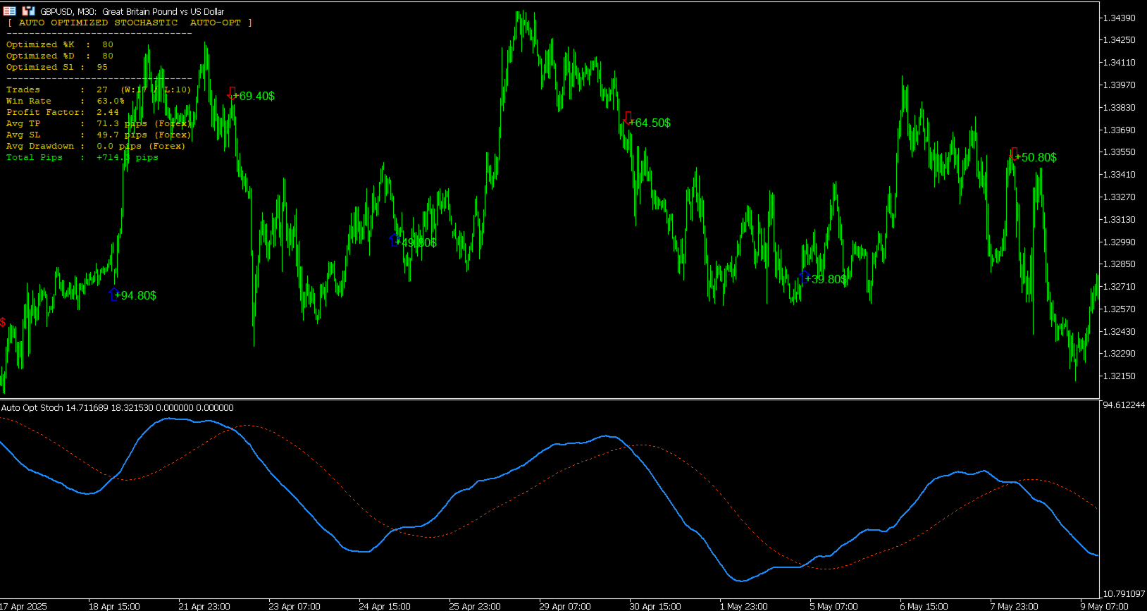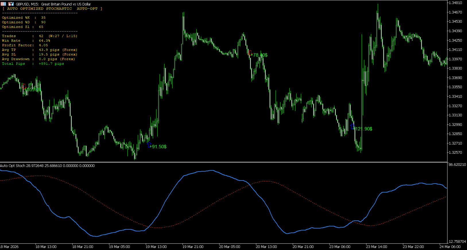 Personalização e Entradas Os traders mantêm controle total sobre as barras de histórico para otimização (lookback), requisitos mínimos de operações e intervalos de pesquisa de parâmetros (Mín/Máx/Passo). Um modo manual também está disponível, permitindo que o indicador funcione como um Estocástico tradicional, mantendo os recursos aprimorados de PnL visual e zonas de alvo ATR.