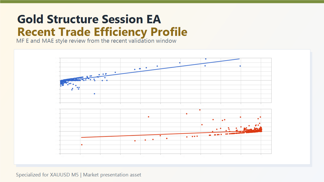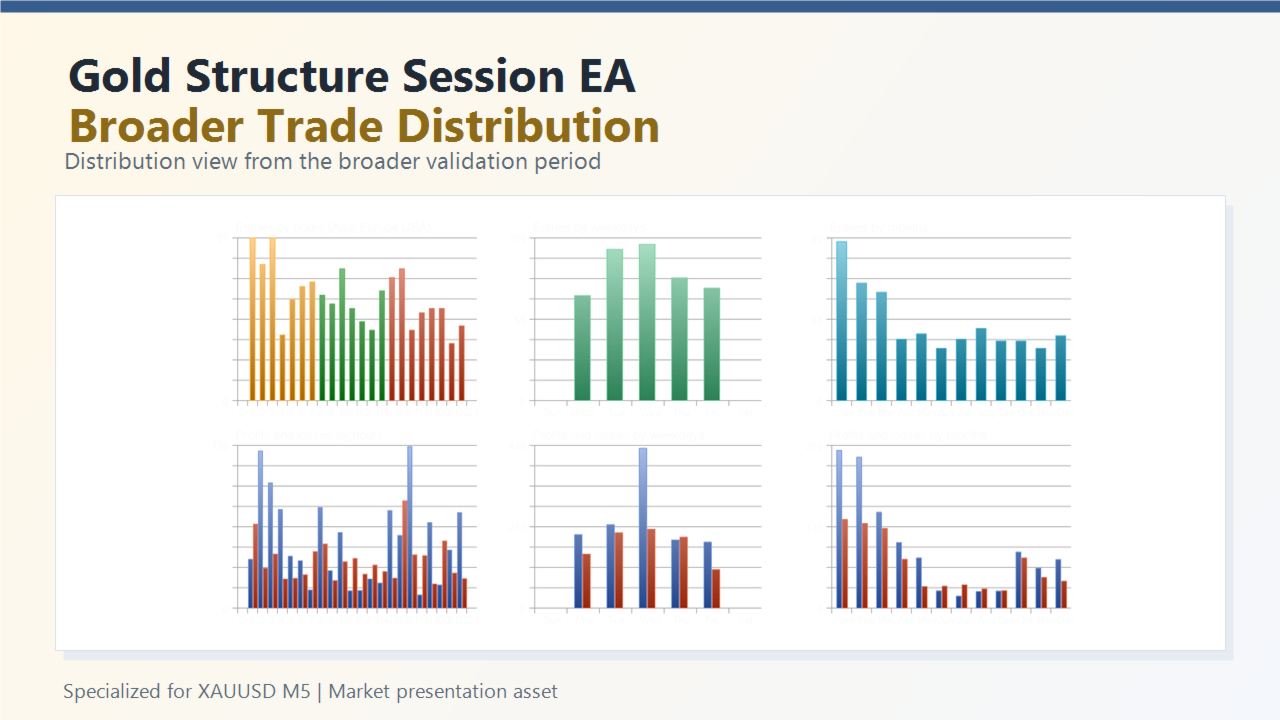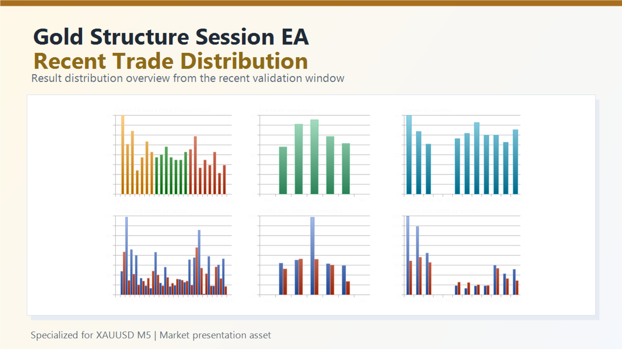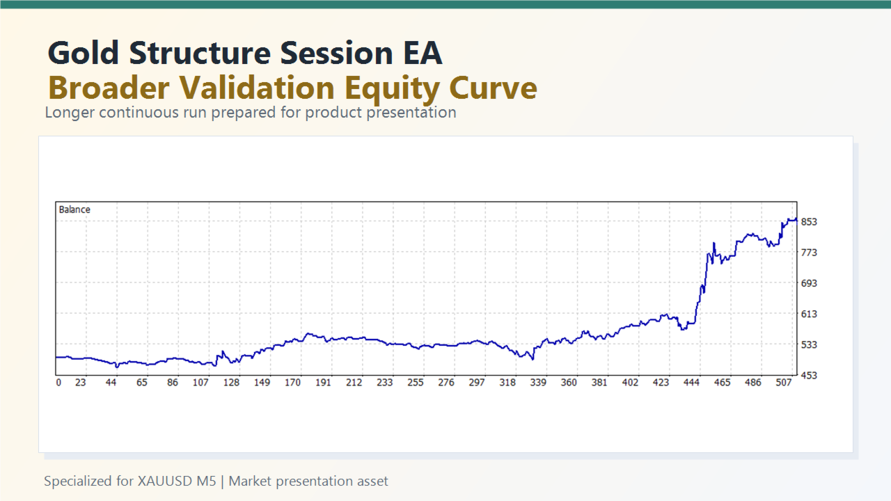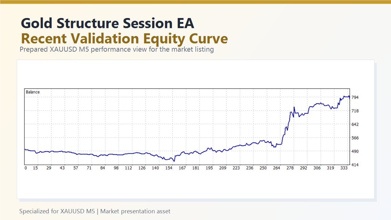 O Gold Structure Session EA é um Expert Advisor para MetaTrader 5 focado no ouro, projetado para negociação intraday disciplinada no par XAUUSD no gráfico de 5 minutos. A estratégia combina viés de tendência, estrutura de oscilação recente, confirmação da zona de Fibonacci e filtragem de volatilidade para buscar entradas mais precisas, evitando sobrenegociações constantes. O objetivo do perfil de lançamento padrão é a execução controlada com gerenciamento de negociações e limites de risco claros. Principais características - Entradas baseadas em estrutura com validação de viés e swing - Filtro de zona de Fibonacci para confirmação de pullback - Gerenciamento integrado de break-even, trailing stop, saída por momentum e saída por tempo - Limite de perda diária, lógica de pausa após perdas e controle de número máximo de negociações por dia - Modo de uma posição para fluxo de execução mais simples - Filtro de sessão para evitar horários de servidor mais fracos Configuração recomendada - Símbolo: XAUUSD - Timeframe: M5 - Use as configurações padrão integradas - Mais adequado para corretoras com spreads de ouro estáveis e condições normais de stop loss Observações importantes - Este produto é especializado em ouro e não se destina a ser um EA universal para múltiplos pares - As configurações padrão são o perfil de lançamento recomendado - Riscos mais altos são possíveis com as entradas, mas o perfil padrão é a opção disciplinada para uso real - Não são necessárias DLLs externas ou arquivos extras Entradas principais - RiskPerTradePct: porcentagem de risco por negociação - MaxDailyLossPct: limite de perda de capital diário - MaxTradesPerDay: limite máximo de negociações diárias - RewardRisk: alvo em relação ao tamanho do stop loss - BreakEvenAtR: mover o stop loss para o break-even após o múltiplo R selecionado - TrailAtR: iniciar trailing stop após o múltiplo R selecionado - MomentumExitAtR: permitir saída por momentum após atingir um limite de lucro - MaxBarsInTrade: limite de saída baseado em tempo - StartHourServer e EndHourServer: janela de negociação permitida