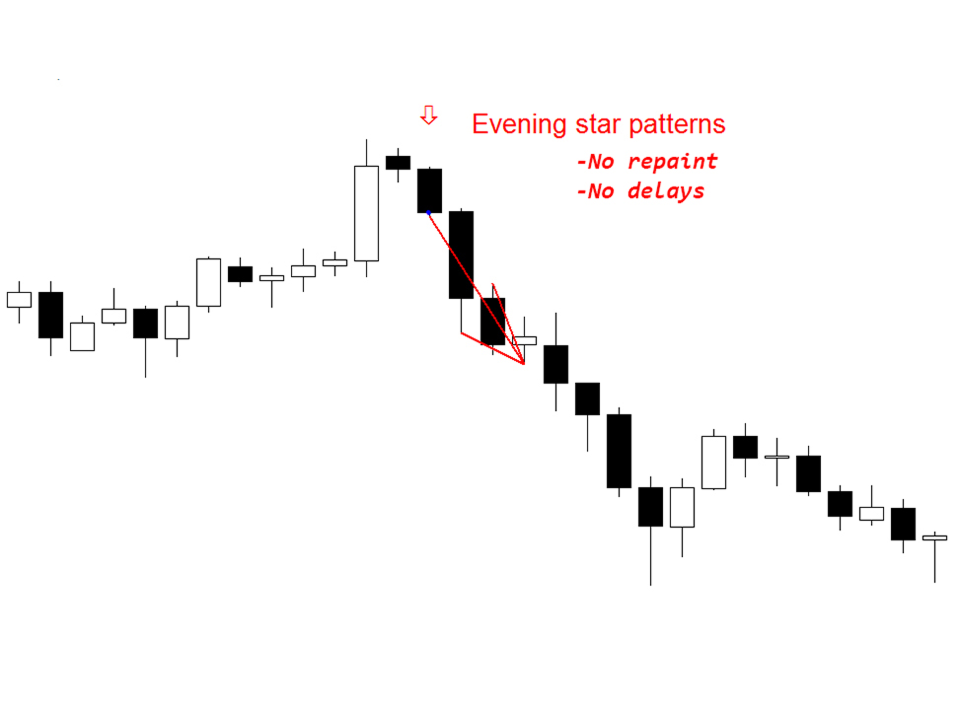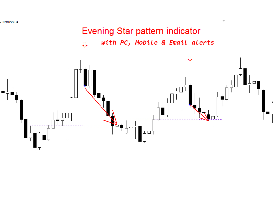 - O indicador detecta padrões Estrela da Noite de baixa no gráfico: sinal de seta vermelha no gráfico (veja as imagens).