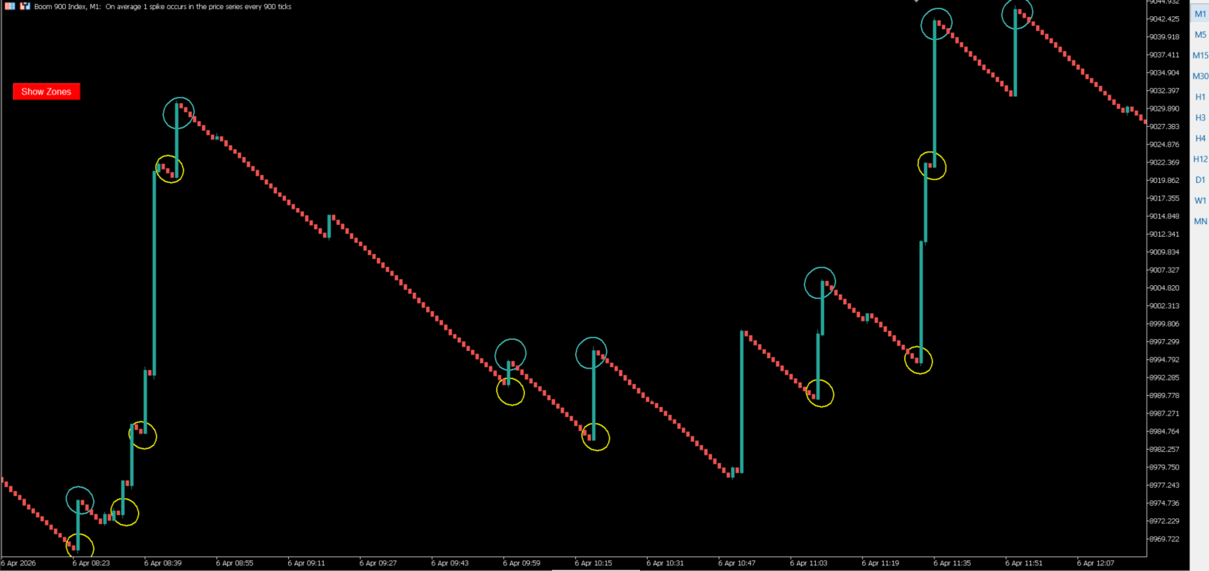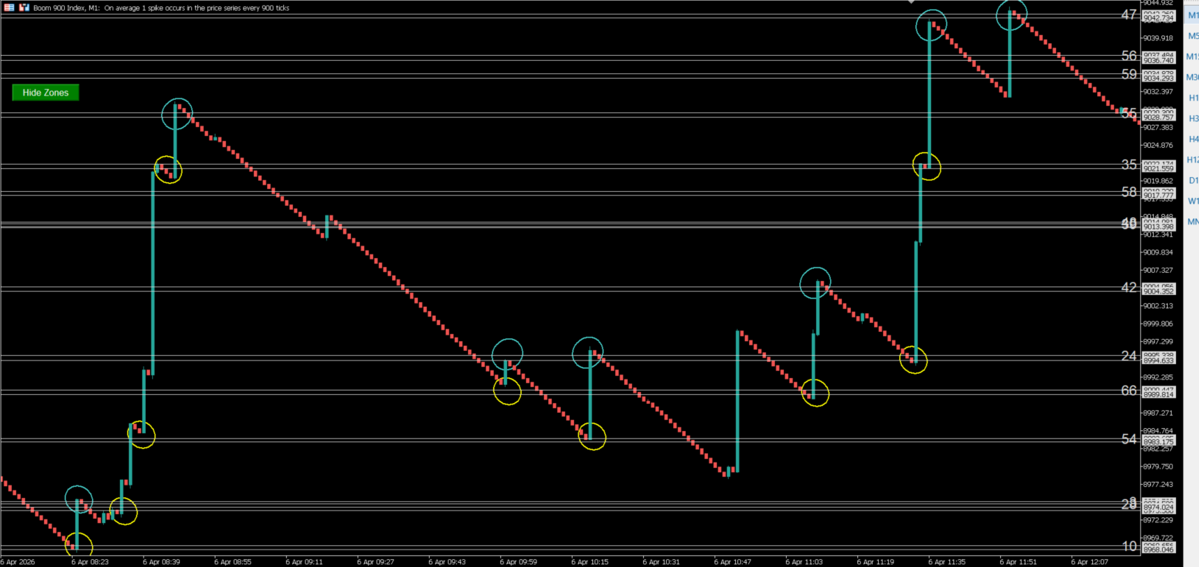 Impulse Zone Spike Detector is a MetaTrader 5 indicator that detects and draws horizontal interest zones around impulse-style spike movements on Boom and Crash indices.