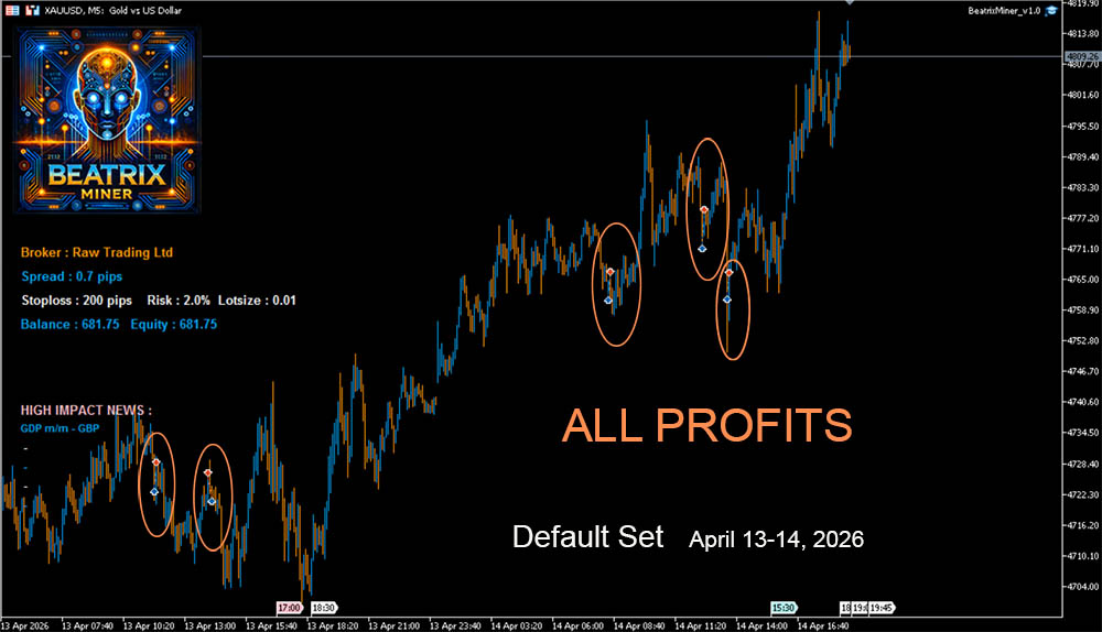 Default Set, trading date 13-14 April 2026, 5 trades all in profit