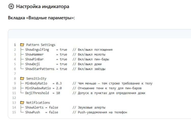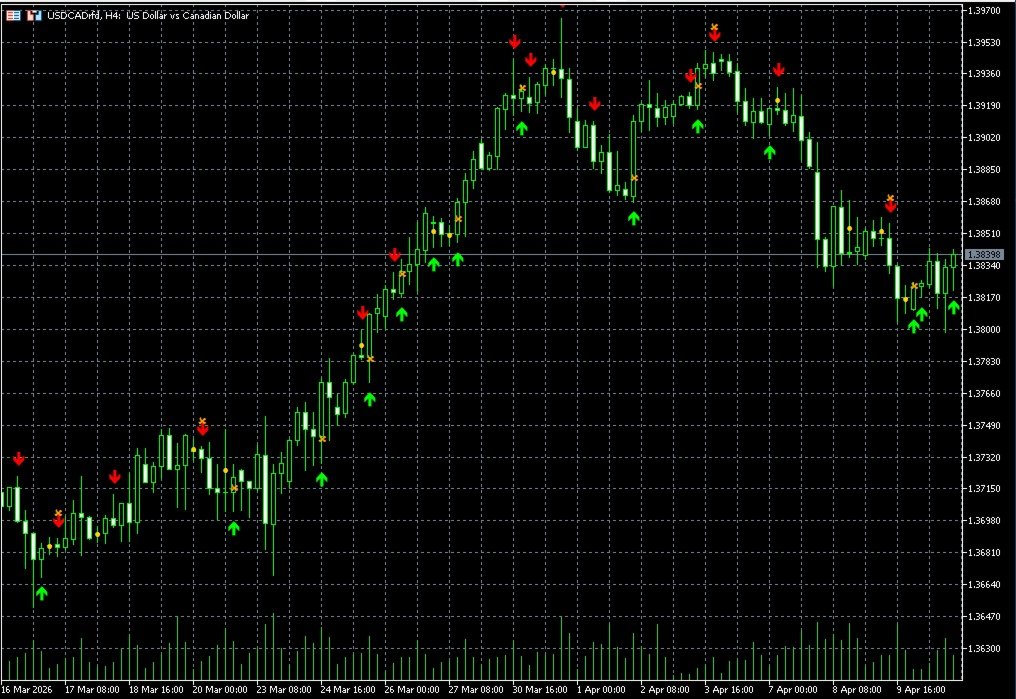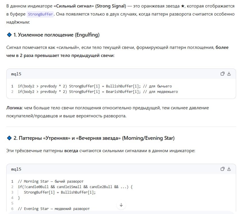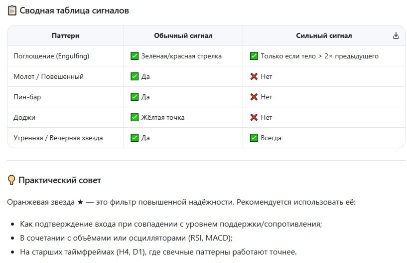 O indicador reconhece automaticamente os padrões clássicos de velas de reversão e os visualiza no gráfico usando setas coloridas. Funciona em tempo real, analisando as velas mais recentes.