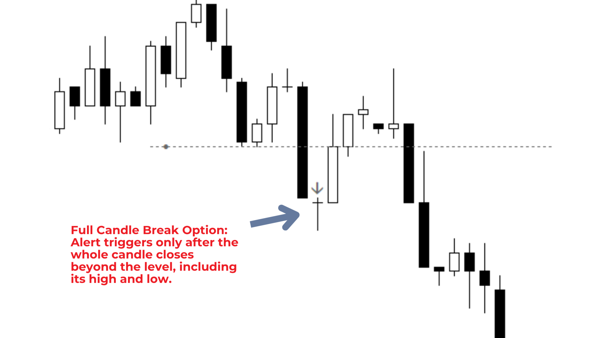 All important parts of the monitoring process are shown clearly on the chart, including the break level, the trigger candle, and the original alert setup time.