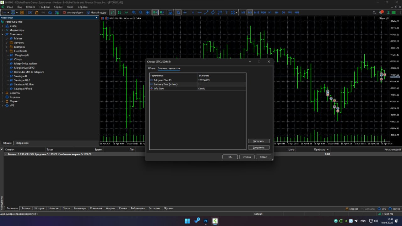 This tool is designed exclusively for broadcasting trading account events to Telegram (@ChoparTradeBot). It does not perform market analysis or provide financial advice; instead, it functions as an informational bridge between your MT5 terminal and the messenger.