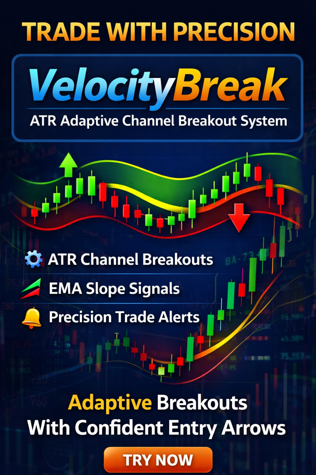 Conceito Principal: Combina canais dinâmicos baseados em ATR com filtragem de inclinação de EMA para identificar breakouts reais, minimizando sinais falsos.