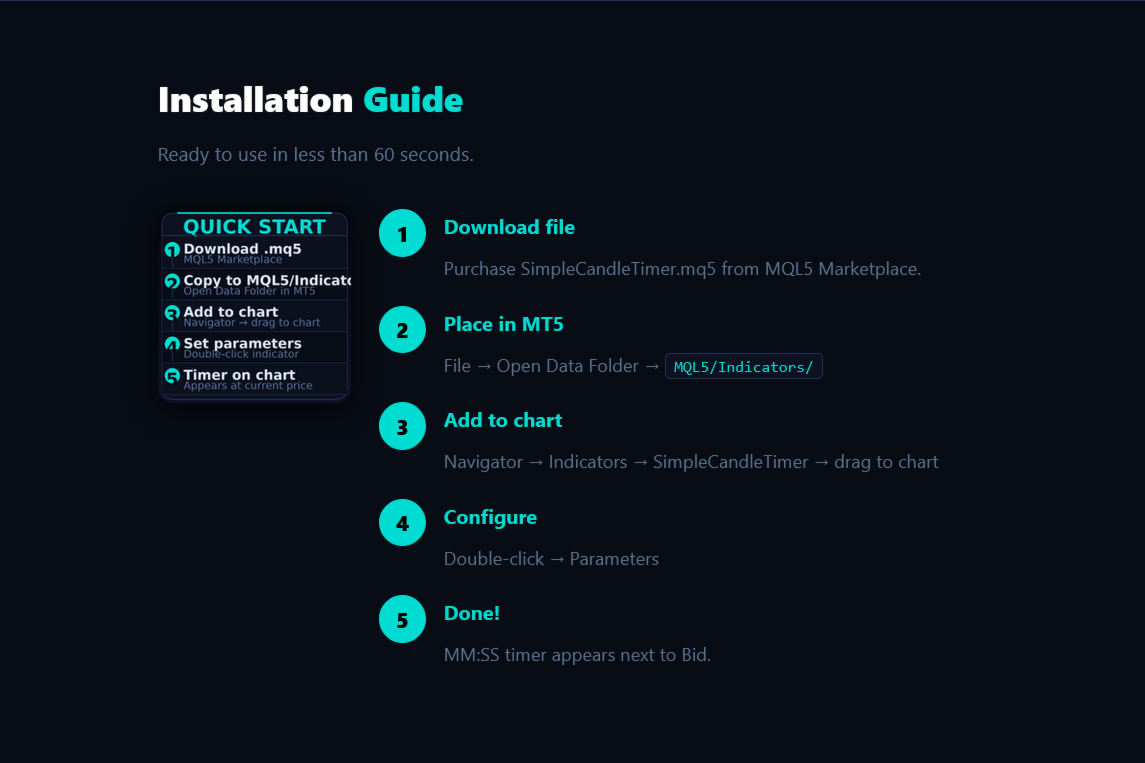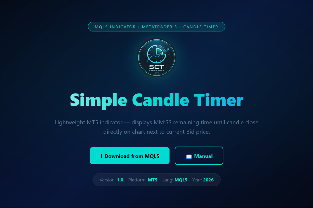 Simple Candle Timer v1.0 is a lightweight MetaTrader 5 indicator.