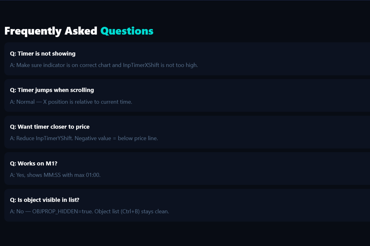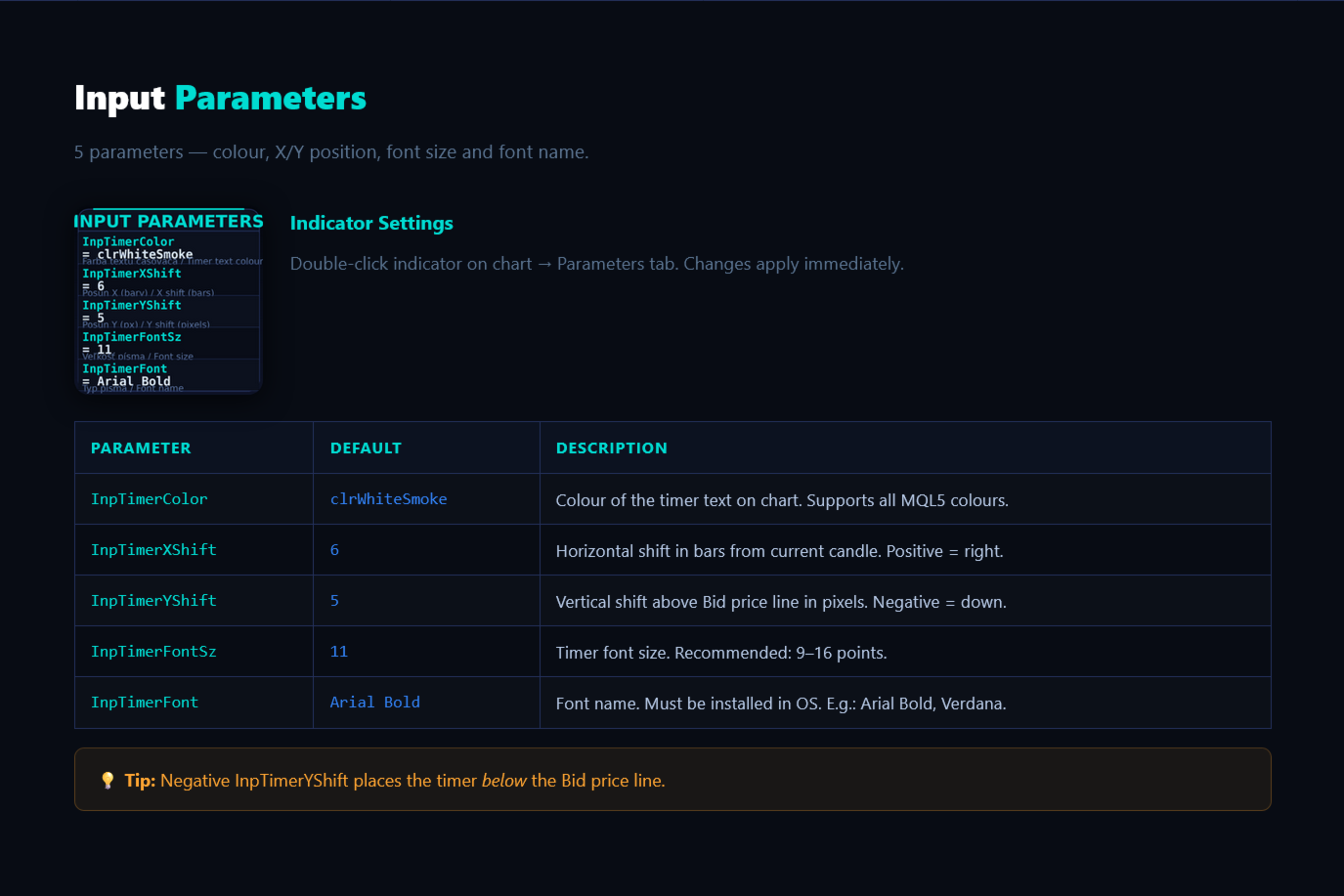 X shift (InpTimerXShift)Higher value moves timer further right from current candle. For narrow chart use 3–4, for wide monitor 8–10.