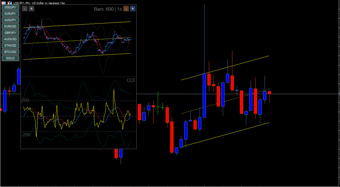 This tool generates a second‑based chart (1‑second candles) inside a sub‑window—something MT5 cannot display by default—and equips it with a CCI Engine specifically designed for second‑level price action. It is a high‑speed, ultra‑short‑term trading tool built for scalping and binary options.