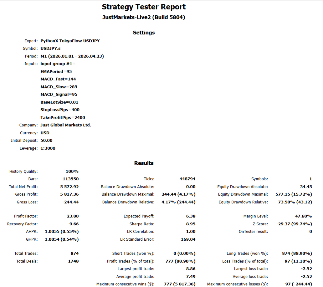 PythonX TokyoFlow USDJPY is a focused EMA and MACD-based trading system built for traders seeking structured, trend-aligned execution with momentum confirmation in a fast intraday environment.