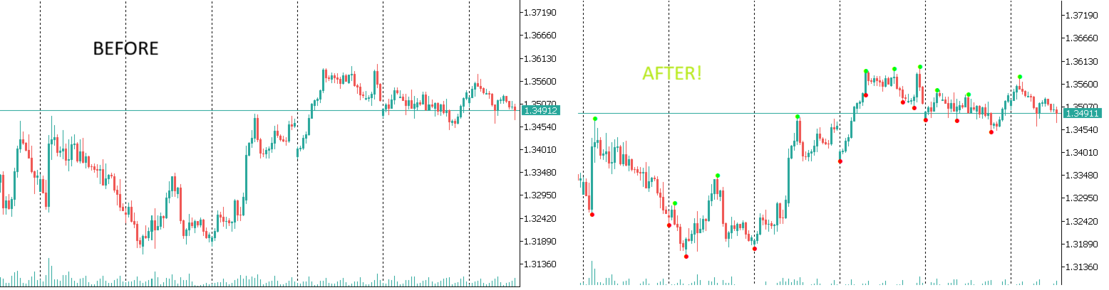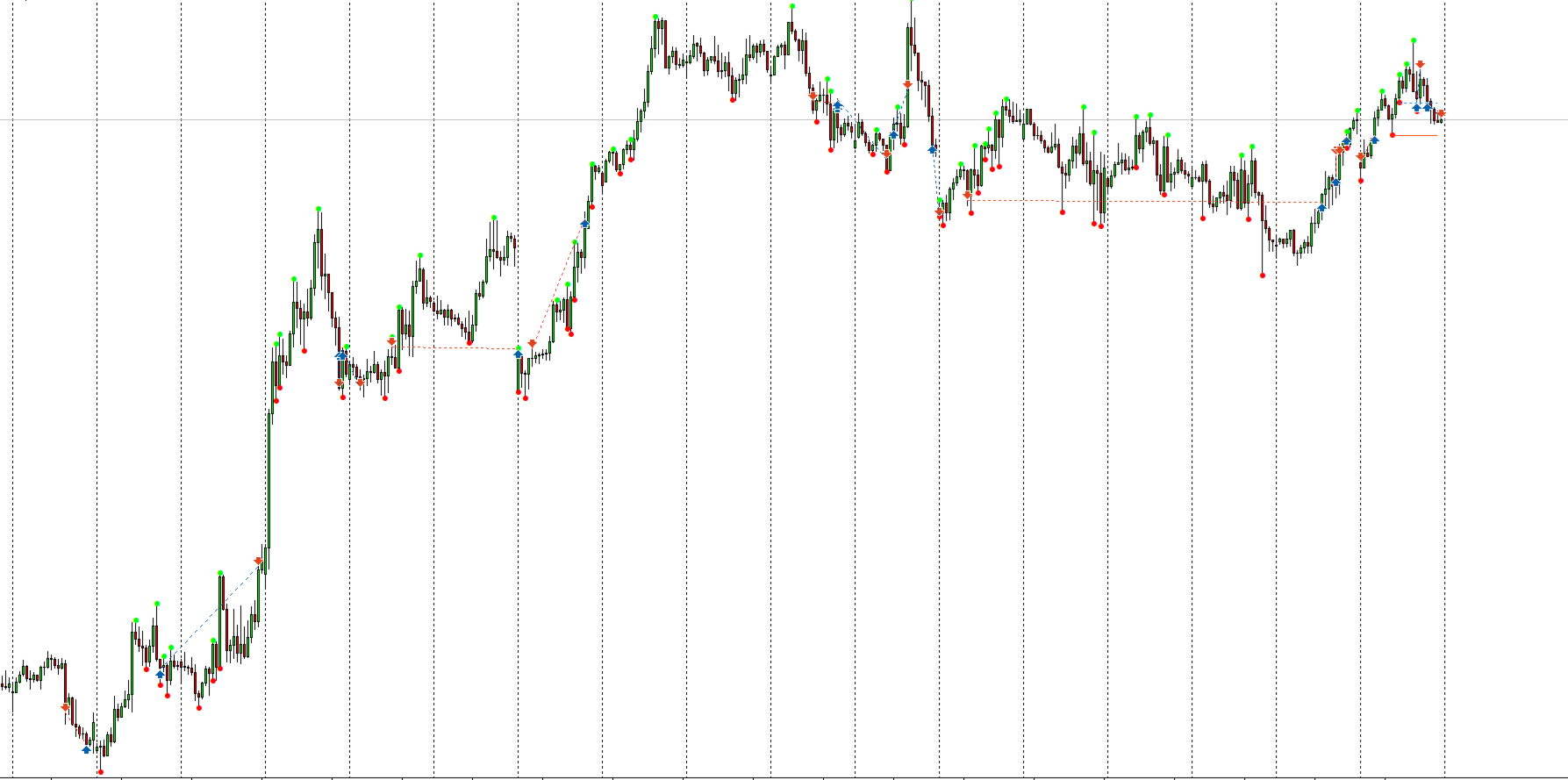 Instant Visual Analysis: Red and green dots define a clear hierarchy of highs and lows.
