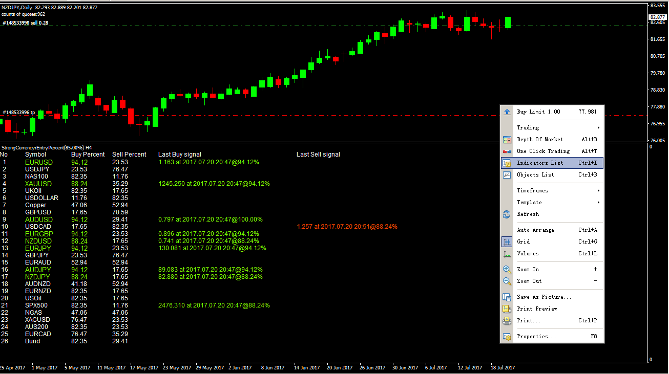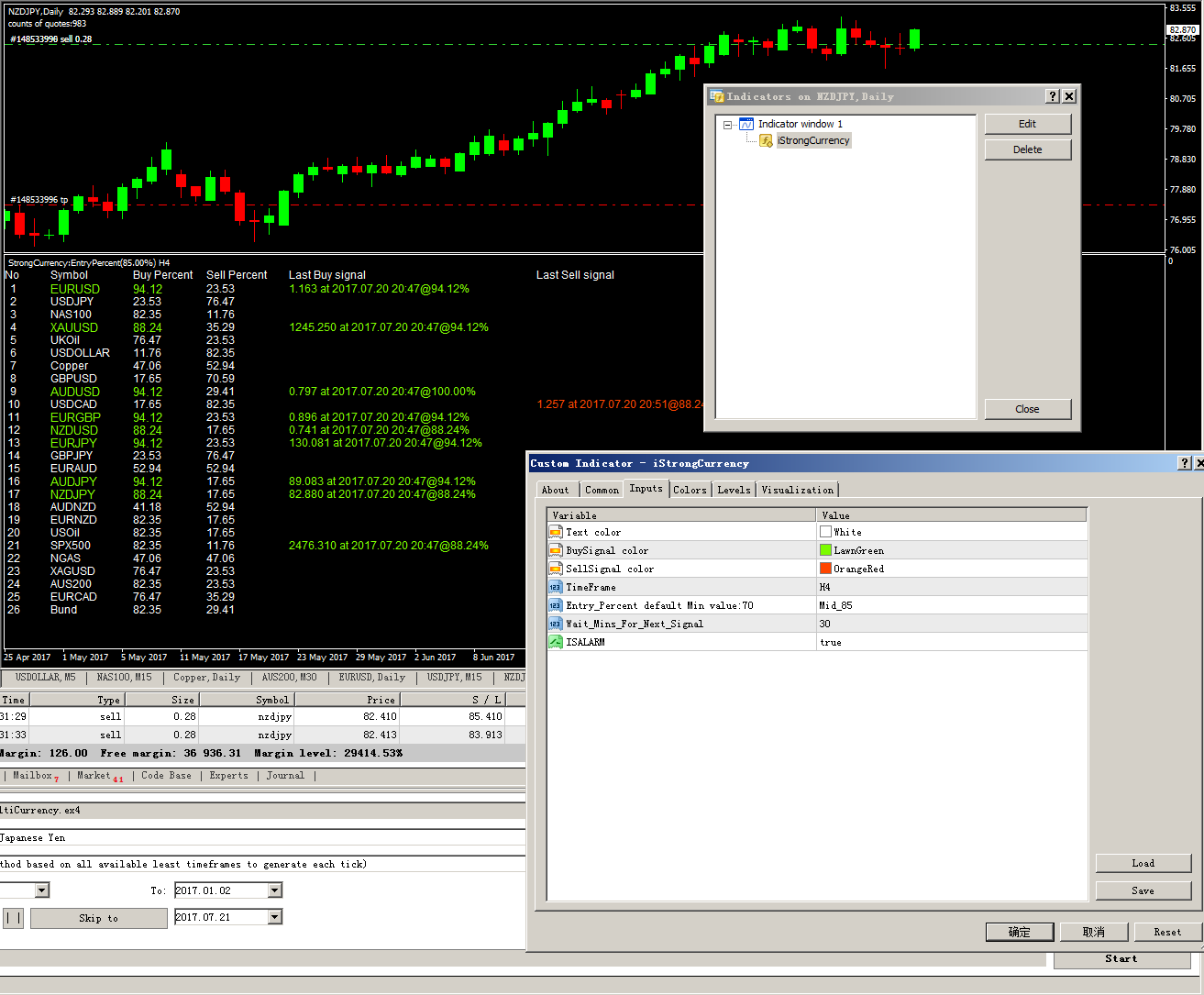 the main trend of the StrongCurrency trend trading strategy Used by the Expert Advisor or Indicator or Manual Trading are opening positions only in the direction of a trend-ability(StrongCurrency TrendPercent:88.24%) for the long-term retention of profitable positions.