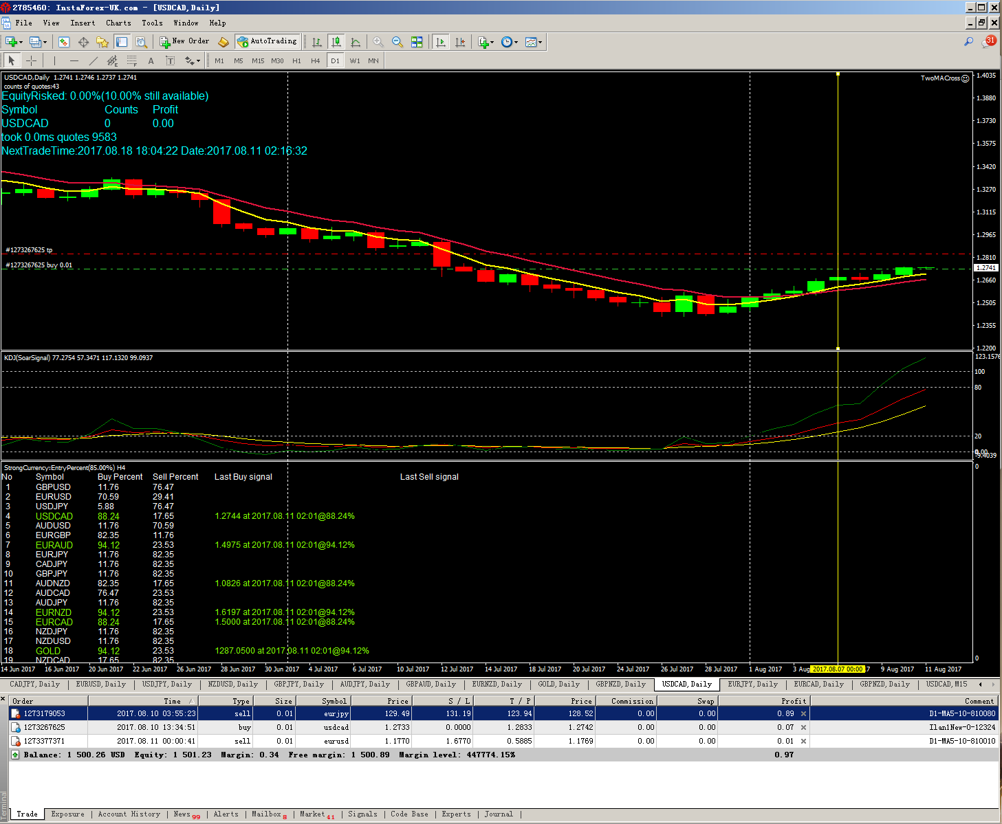 you look at InstaForex this account 2785460 chart, StrongCurrency combined with random indicators SoarSignal and moving average MA5-10 of the USDCAD day line (D1) Long signal at the same time,