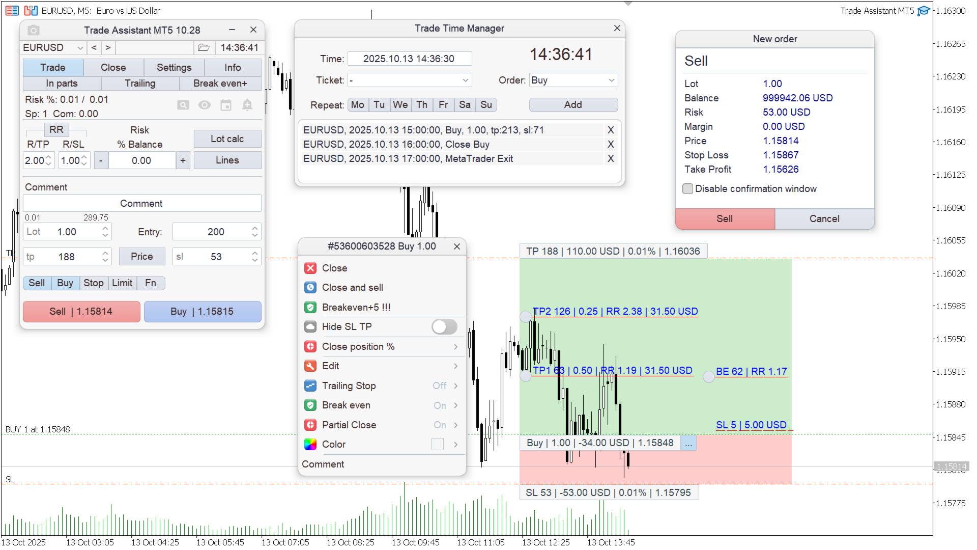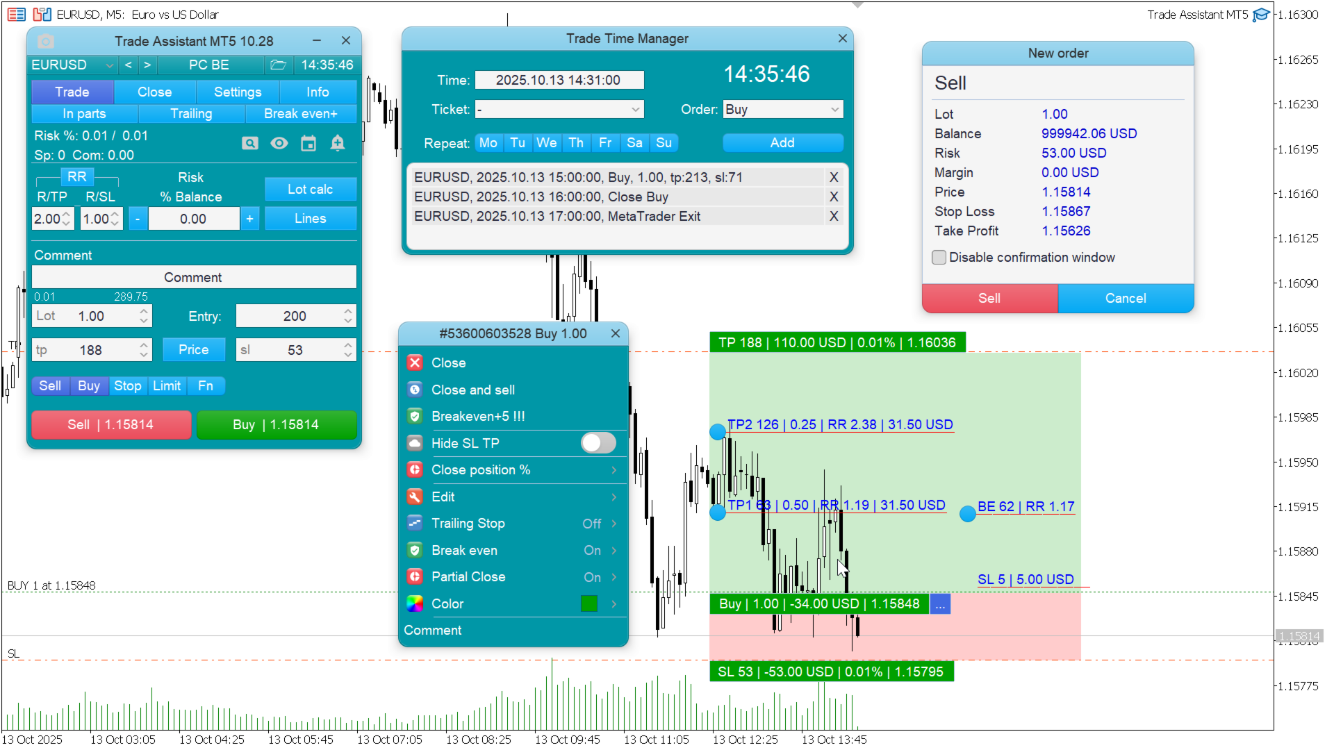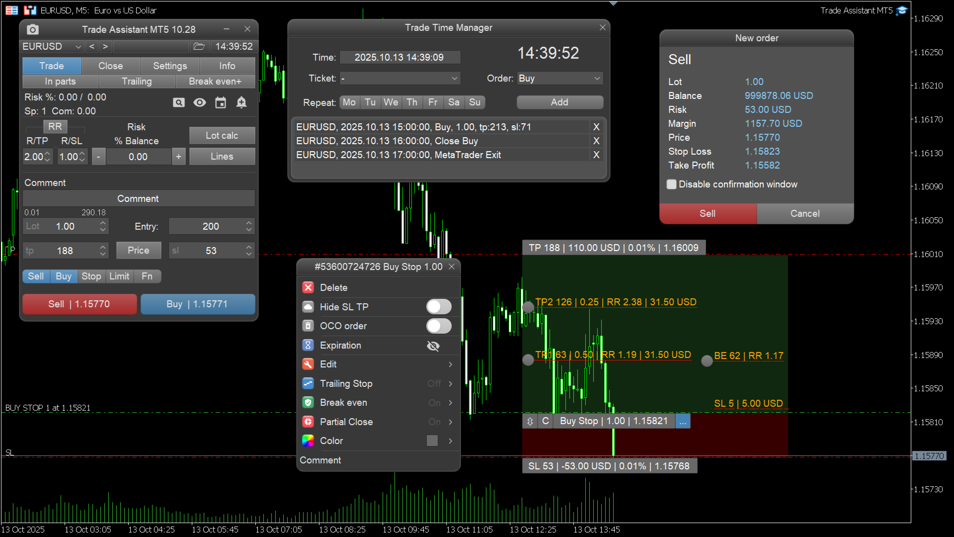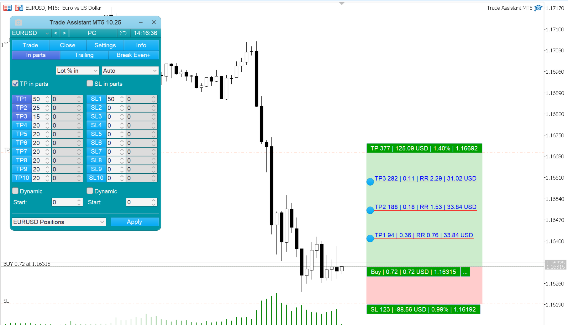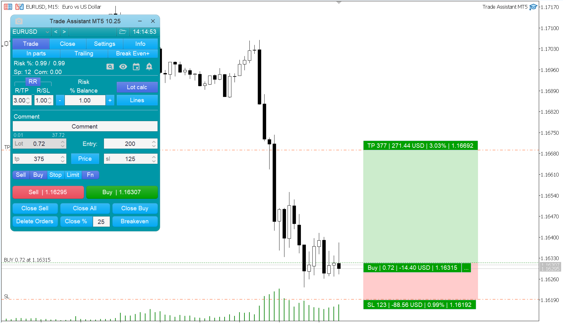 Ajuda a calcular o risco por comércio, a fácil instalação de uma nova encomenda, gestão de encomendas com funções de fecho parcial, trailing stop de 7 tipos e outras funções úteis.