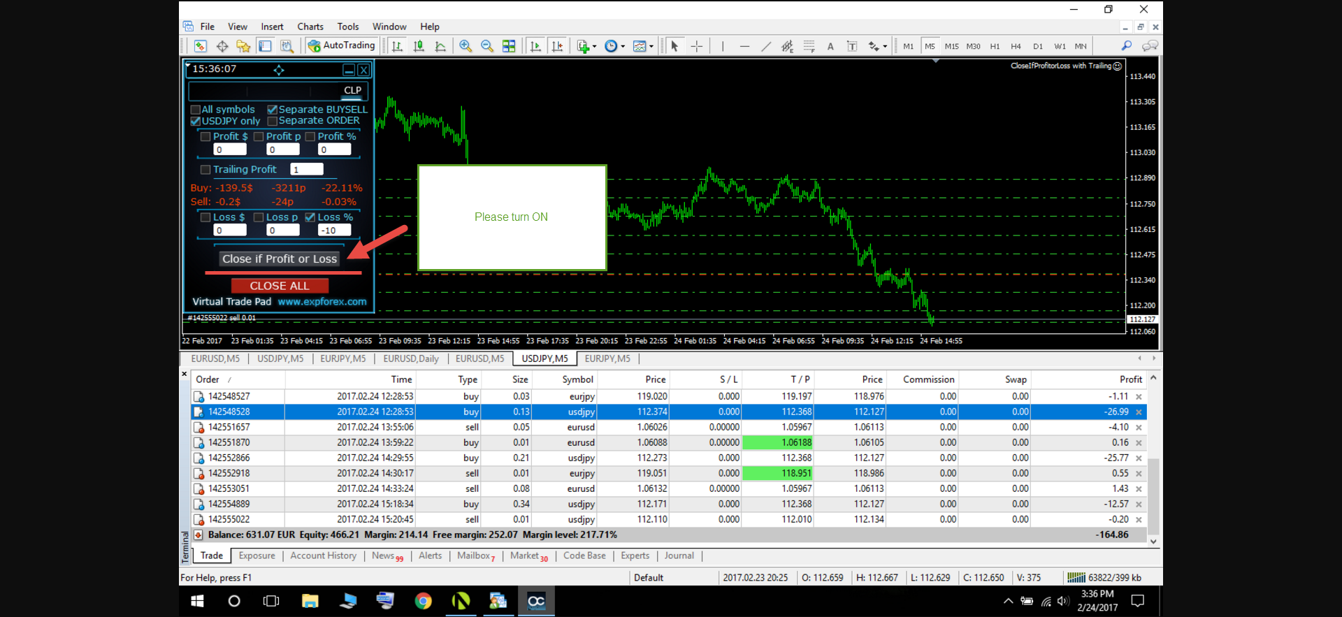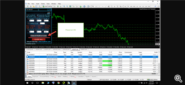 Enable the Close if Profit or Loss button, is should become blue. It means that the Expert Advisor has started working.