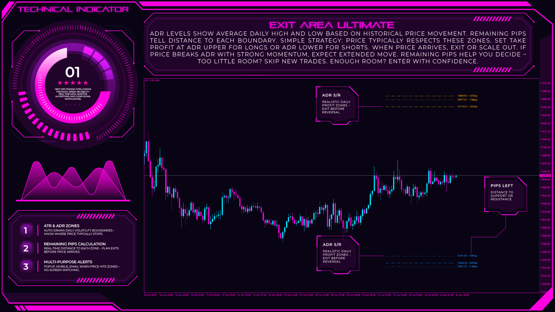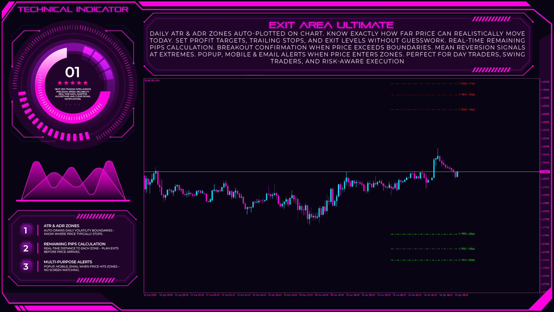 O Exit Area Ultimate não prevê a direção do preço, mas fornece uma estrutura baseada em volatilidade Para definir metas diárias realistas e níveis de stop loss. Para obter os melhores resultados, teste diferentes configurações de período e valores de multiplicador em uma conta demo para adequar ao seu estilo de negociação e sempre combine as zonas com outros métodos de análise, como níveis de suporte/resistência ou confirmação por candlestick, antes de tomar decisões de negociação.