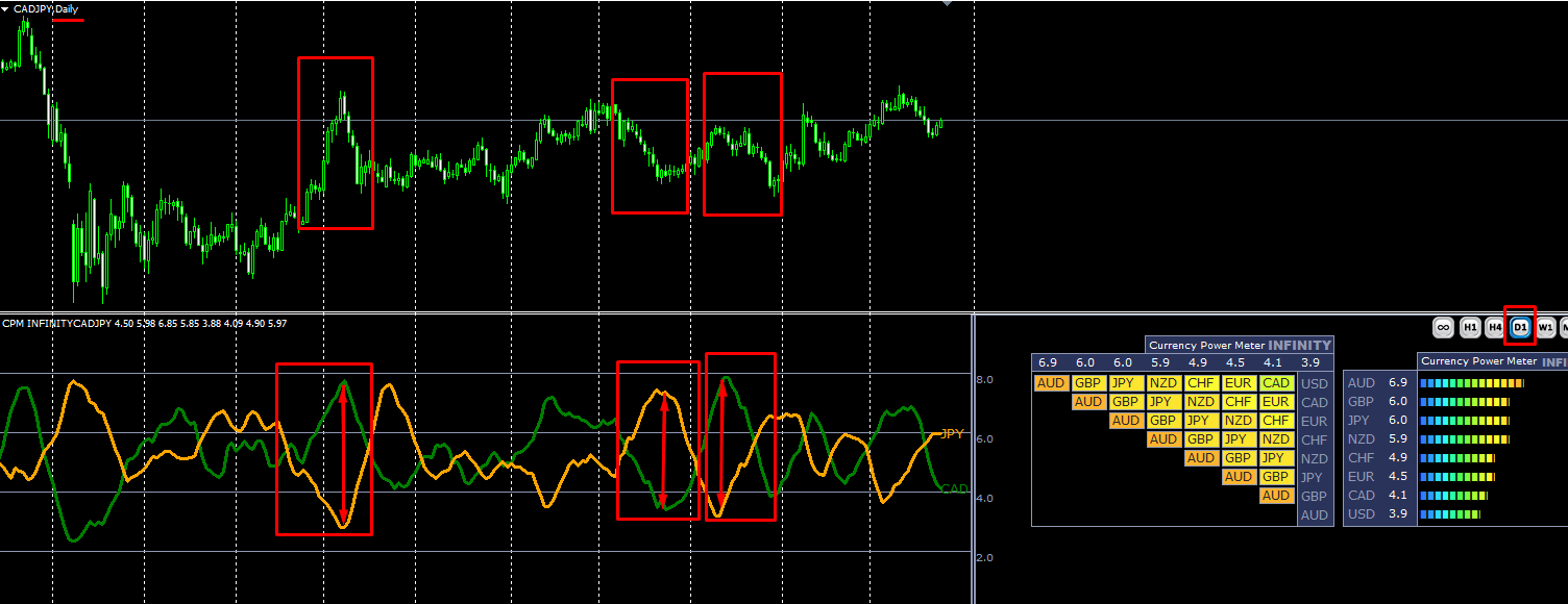 Look. If we set D1 higher timeframe, the CPM calculate power of all pair for last 6 candles (Days)