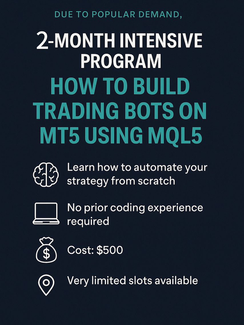 In this upcoming cohort, I’ll guide you step-by-step through the powerful world of MQL5 — the programming language behind MetaTrader 5. Whether you’re a trader who wants to automate strategies or someone looking to start a profitable career as an MQL5 developer, this training is for you!
